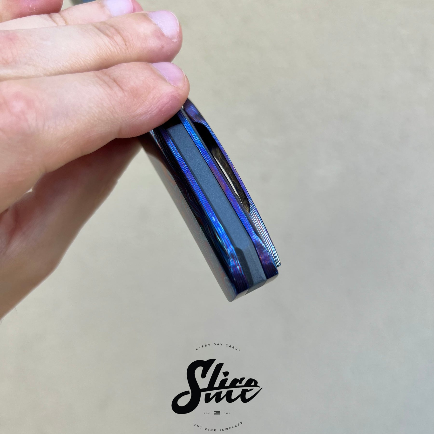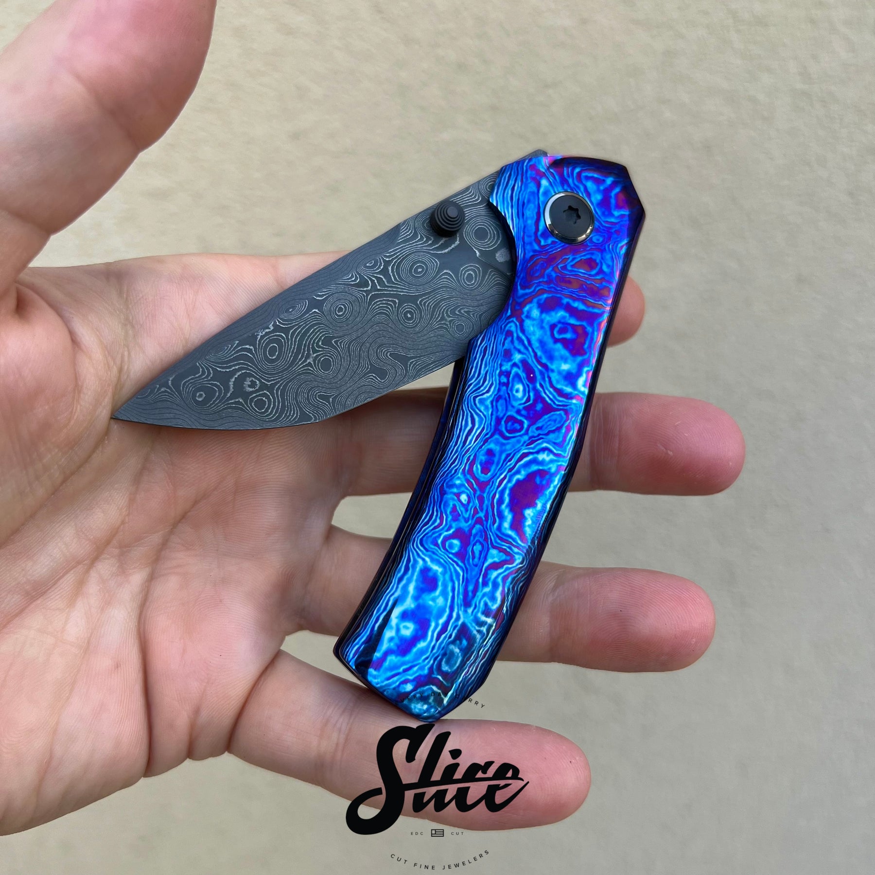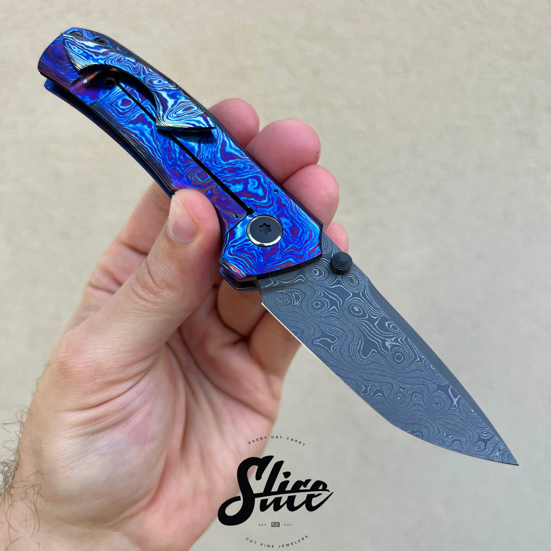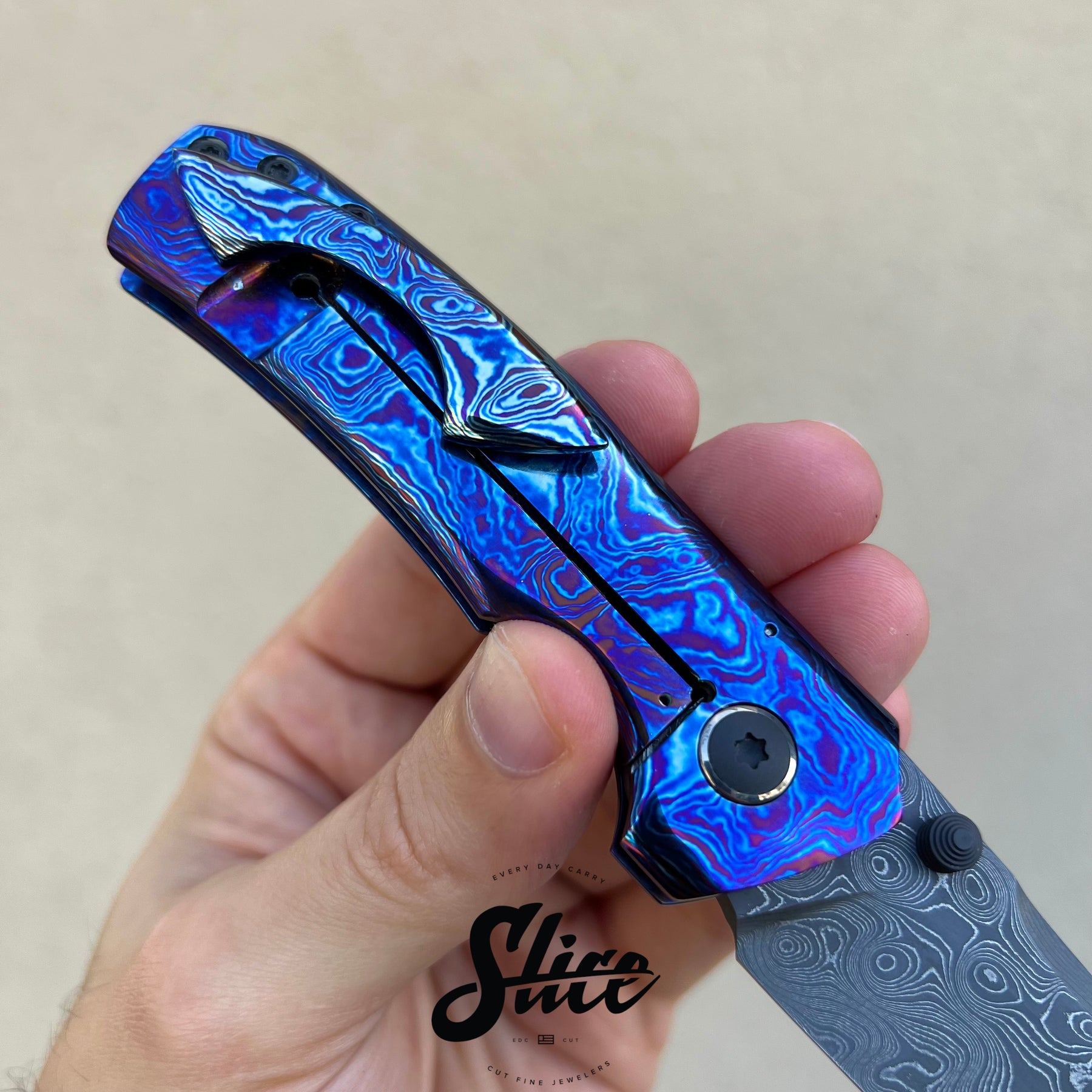 Brian Efros Hustle with a damascus blade on bearings, polished timascus handles with matching sculpted pocket clip, and darkened and beveled titanium spacer.