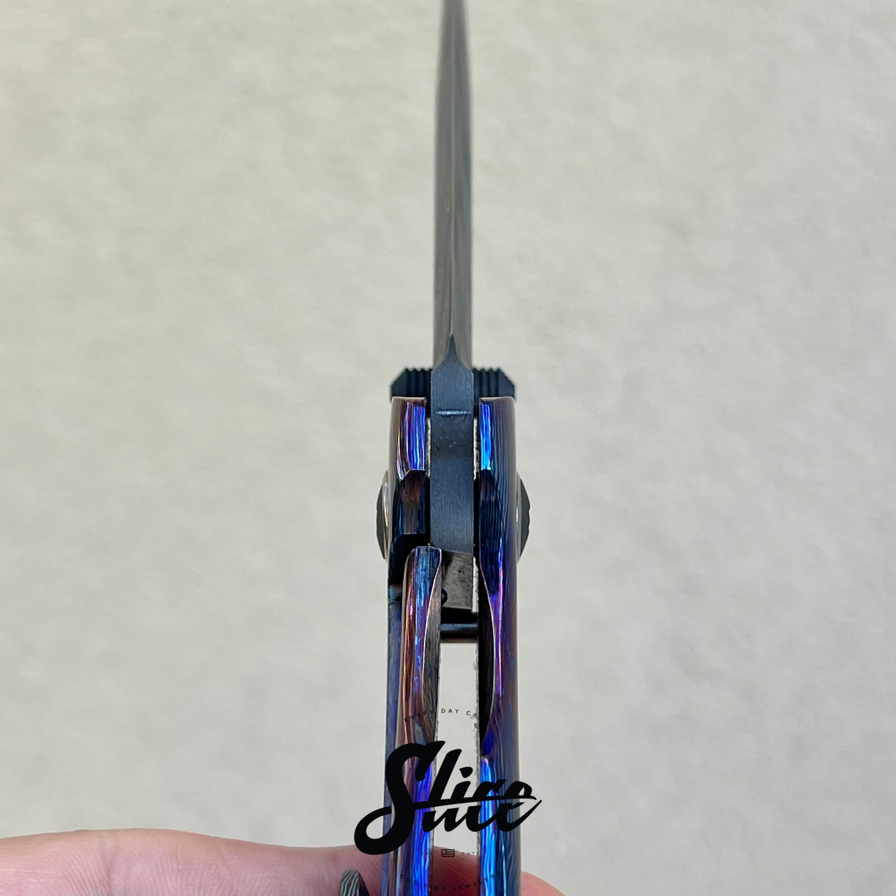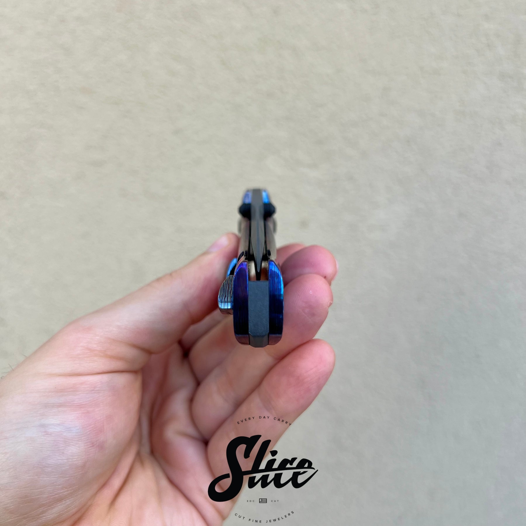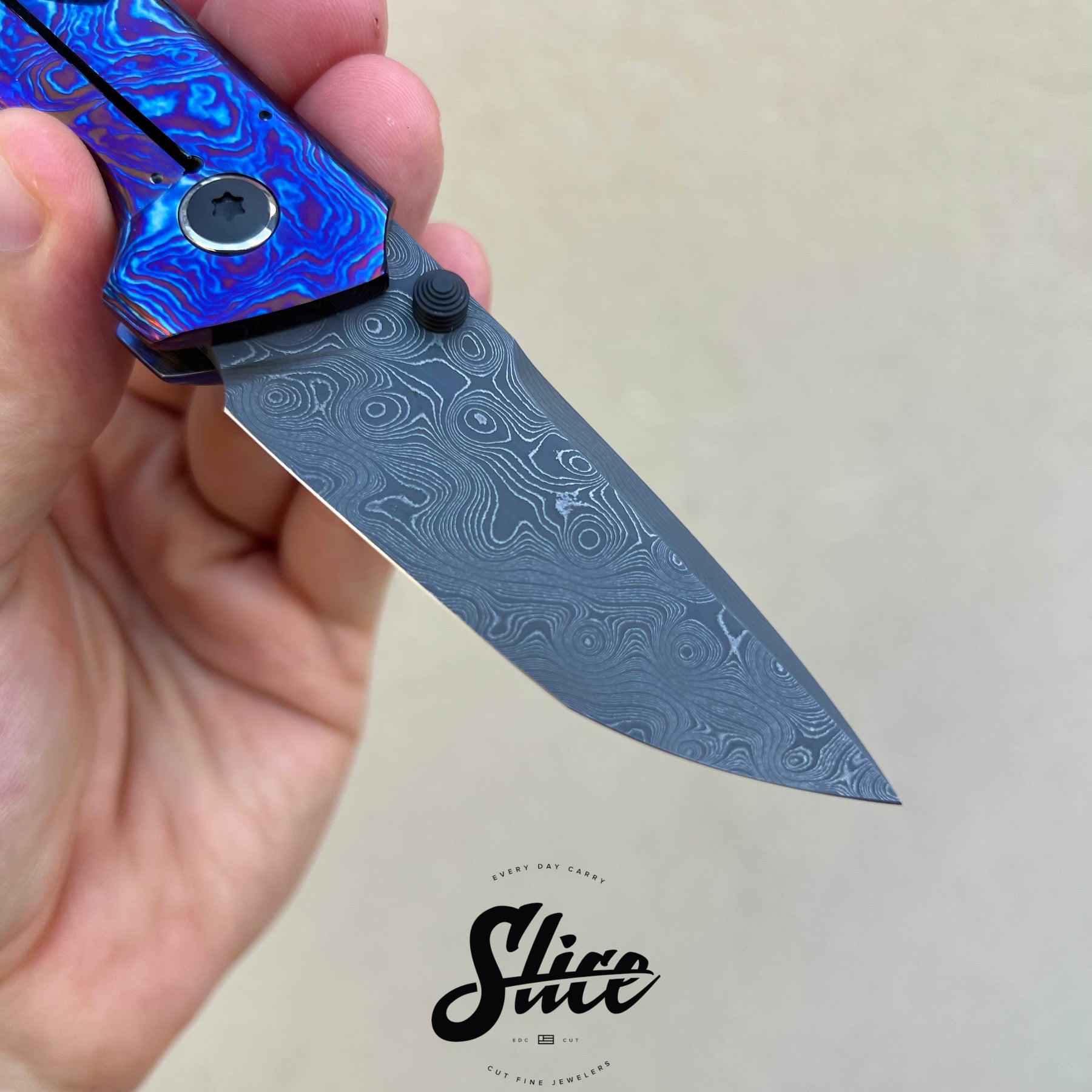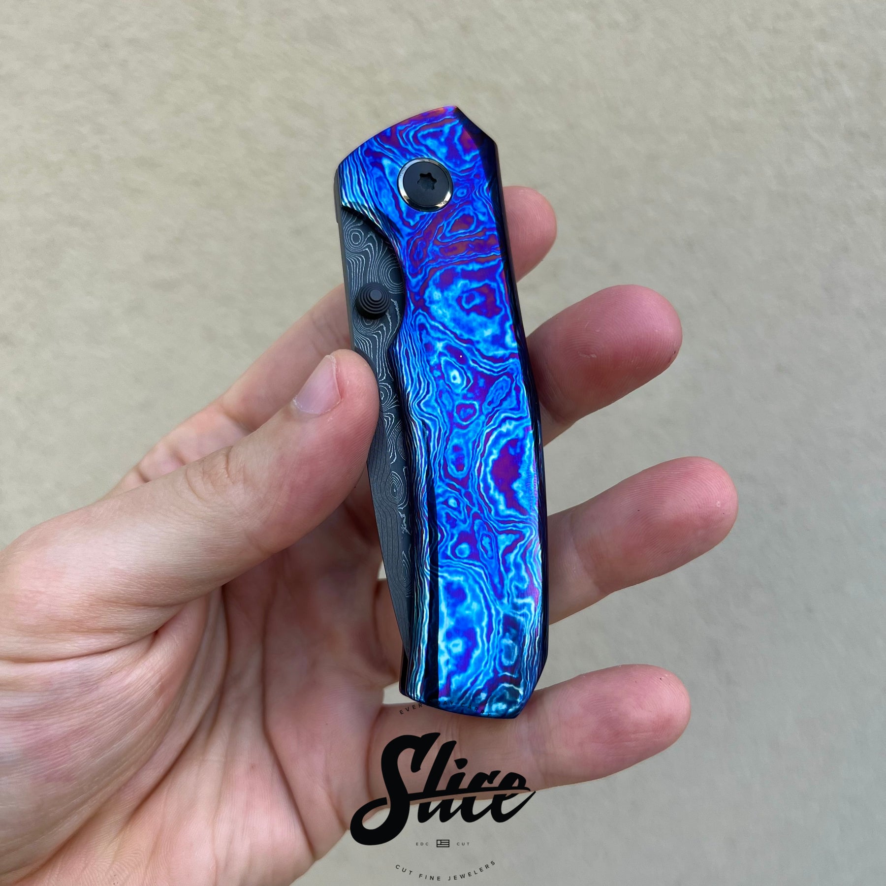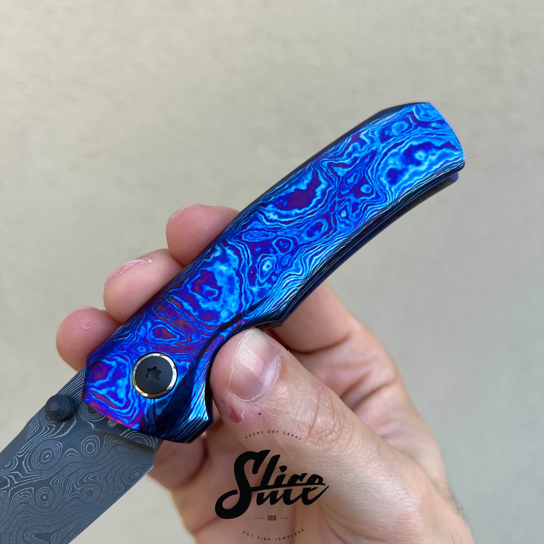 Brian Efros Hustle with a damascus blade on bearings, polished timascus handles with matching sculpted pocket clip, and darkened and beveled titanium spacer.