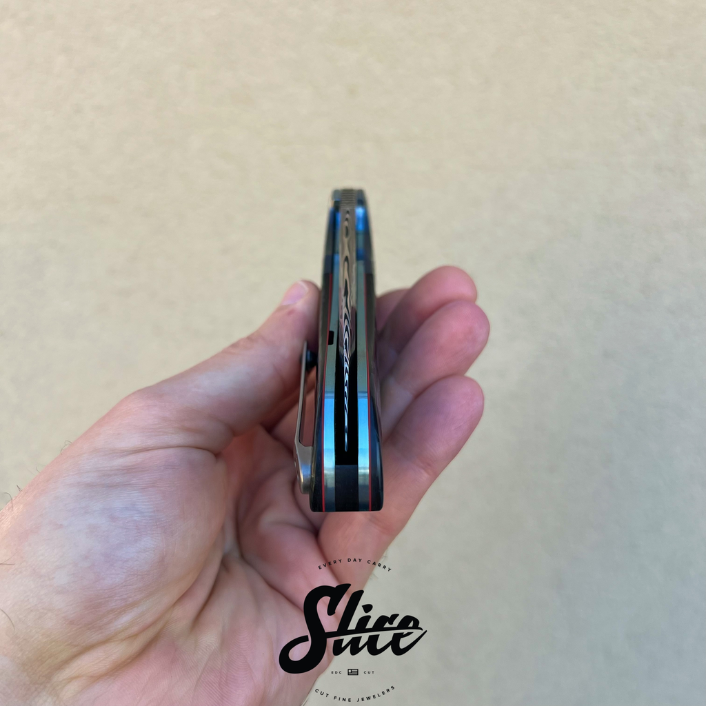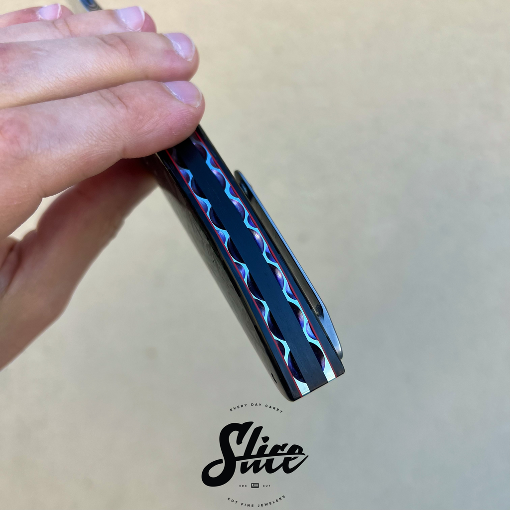 Andre Thorburn L50 with his signature dark etched damasteel blade riding on IKBS, polished zirconium hand engraved by Julien Marchal, polished carbon fiber scales, carbon fiber backspacer, and file-worked and anodized titanium liners.