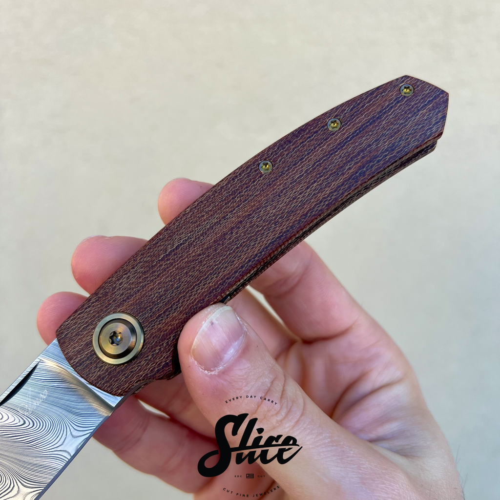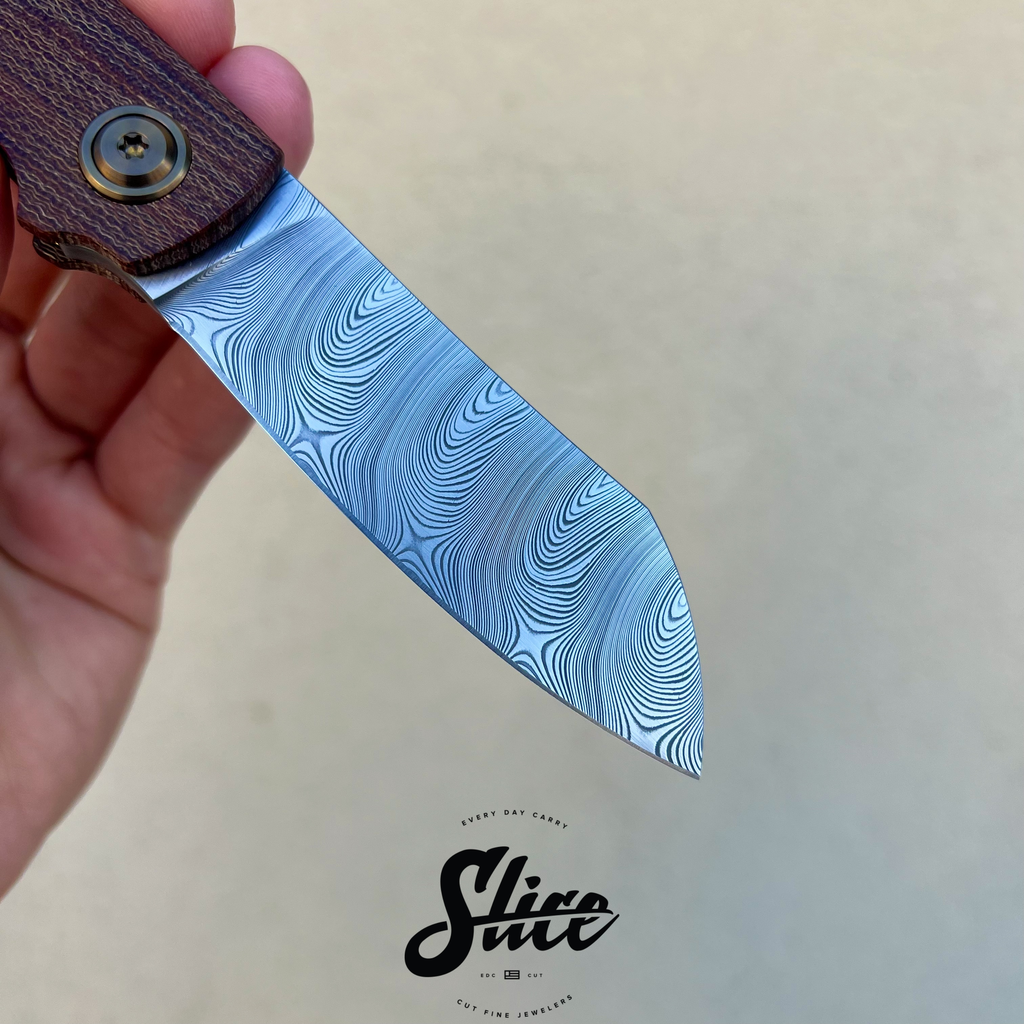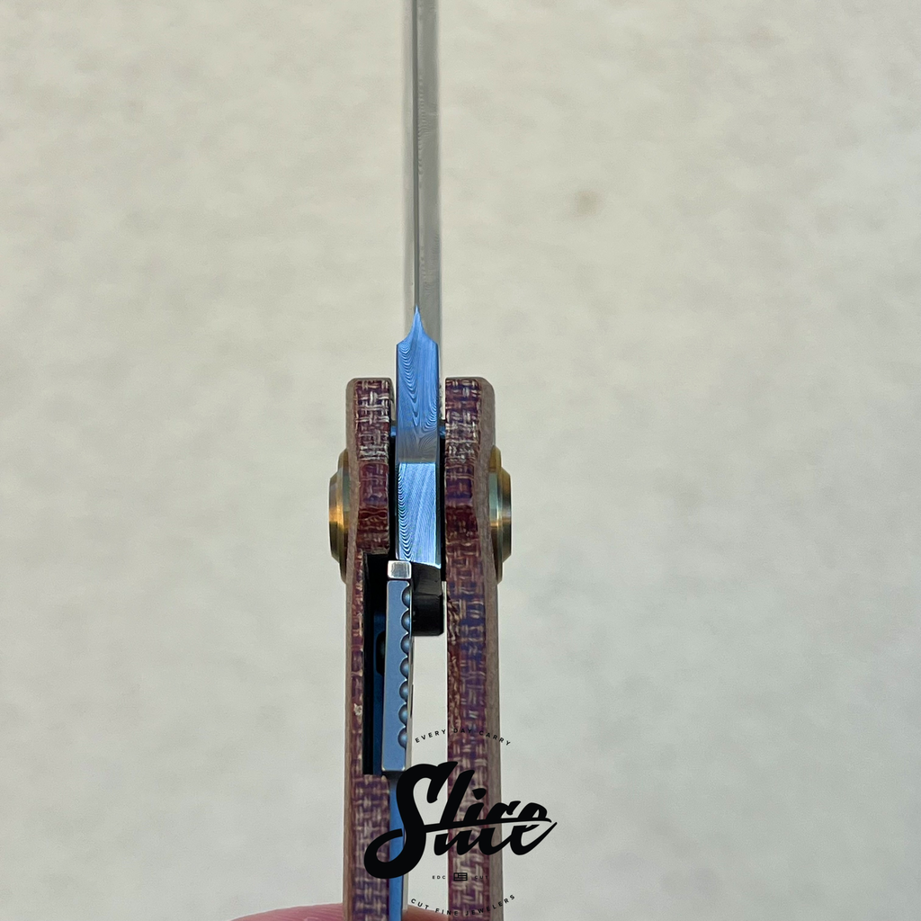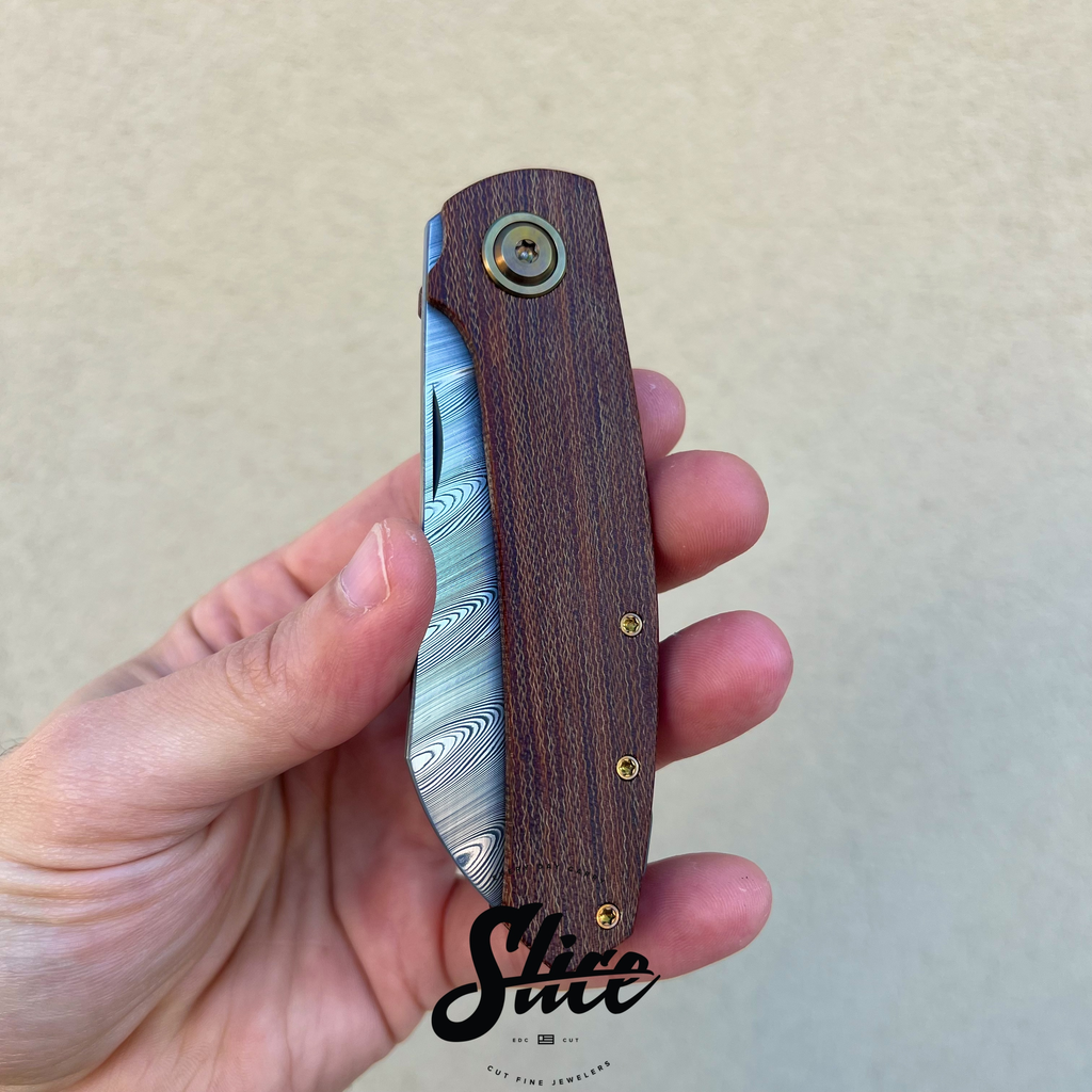 Anso of Denmark Haddock with a Damasteel blade on bearings, cross-cut micarta handles with titanium sub-liners, 3D machined titanium backspacer and pocket clip, and anodized titanium hardware and pivots.