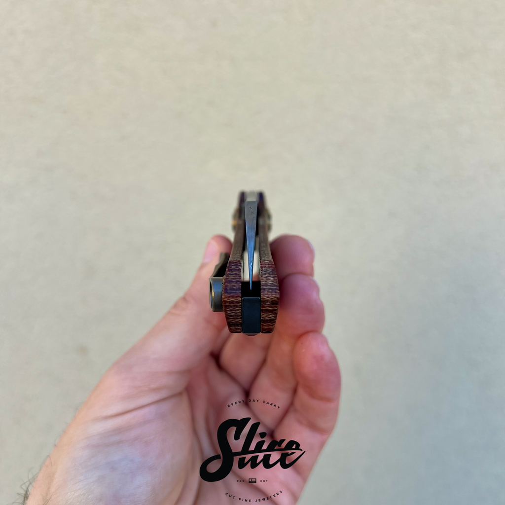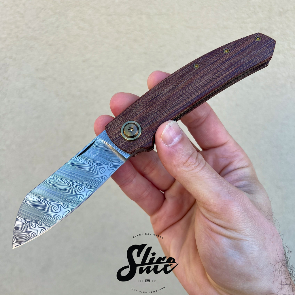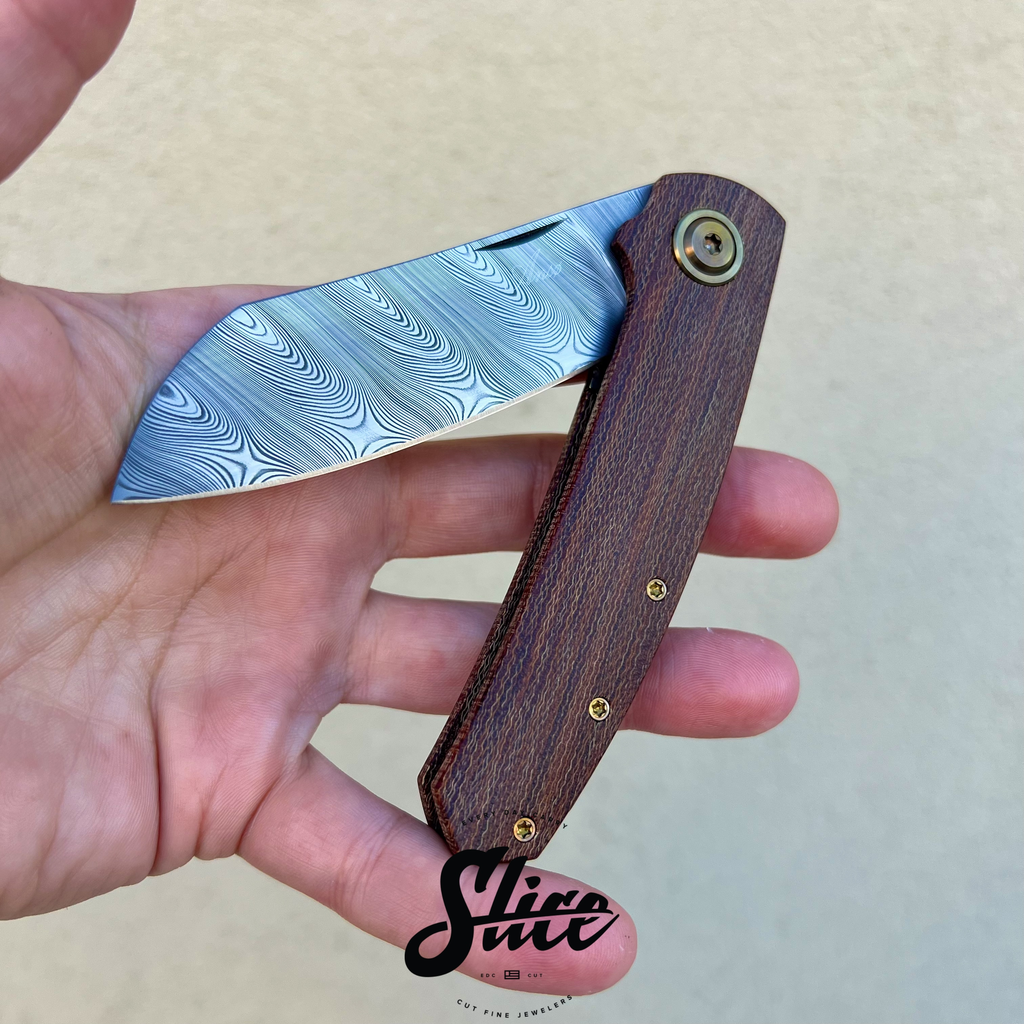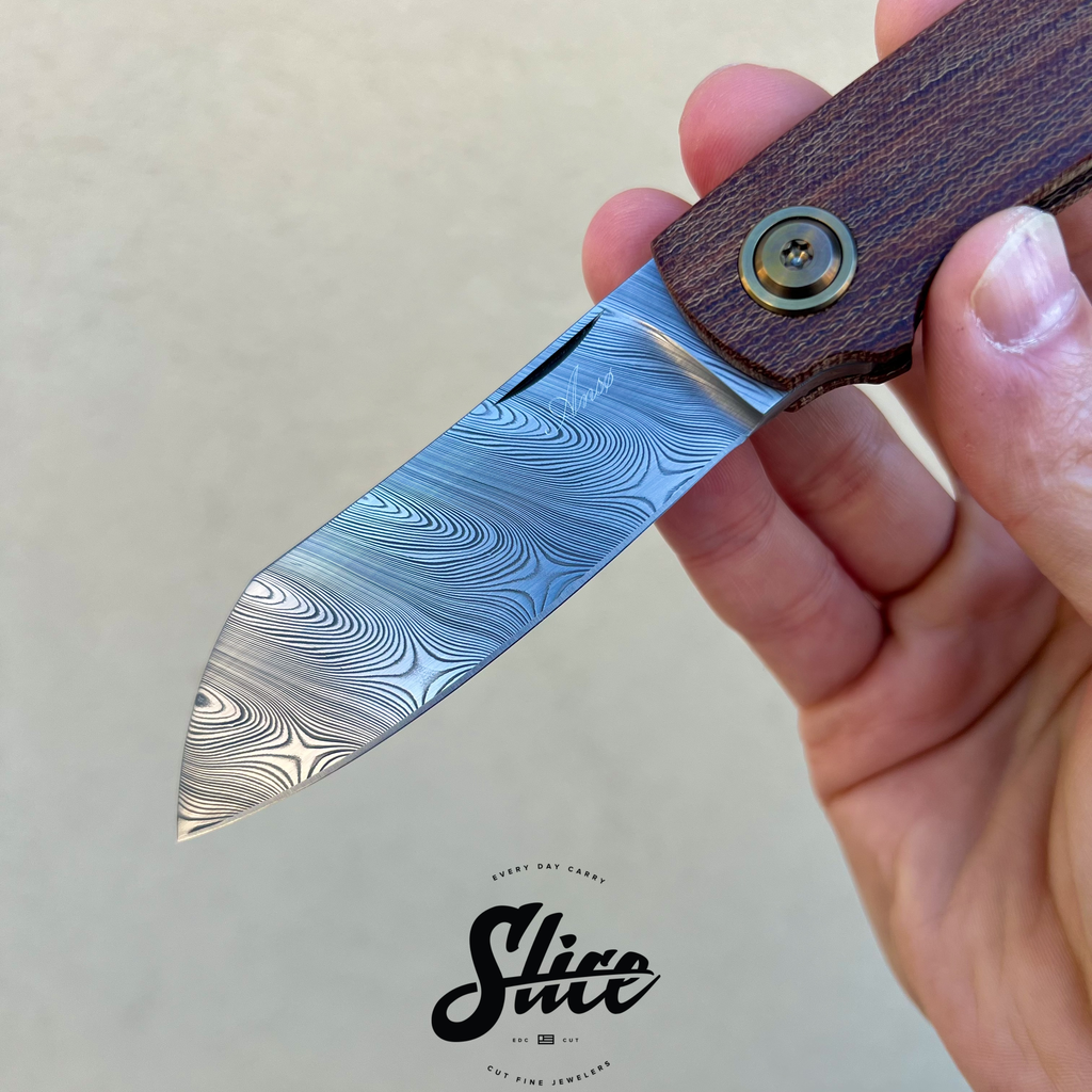 Anso of Denmark Haddock with a Damasteel blade on bearings, cross-cut micarta handles with titanium sub-liners, 3D machined titanium backspacer and pocket clip, and anodized titanium hardware and pivots.
