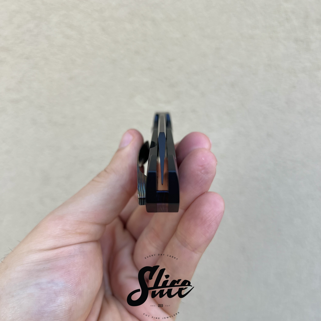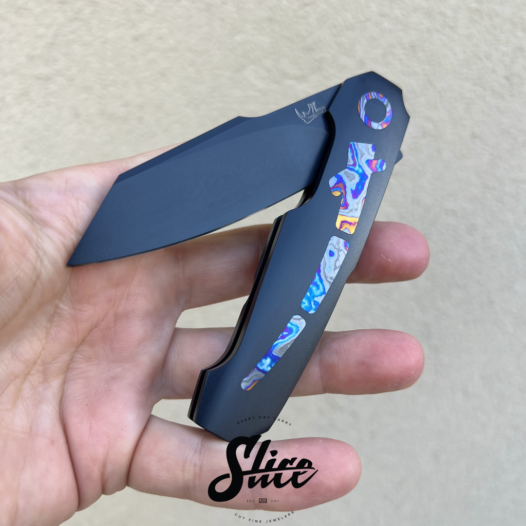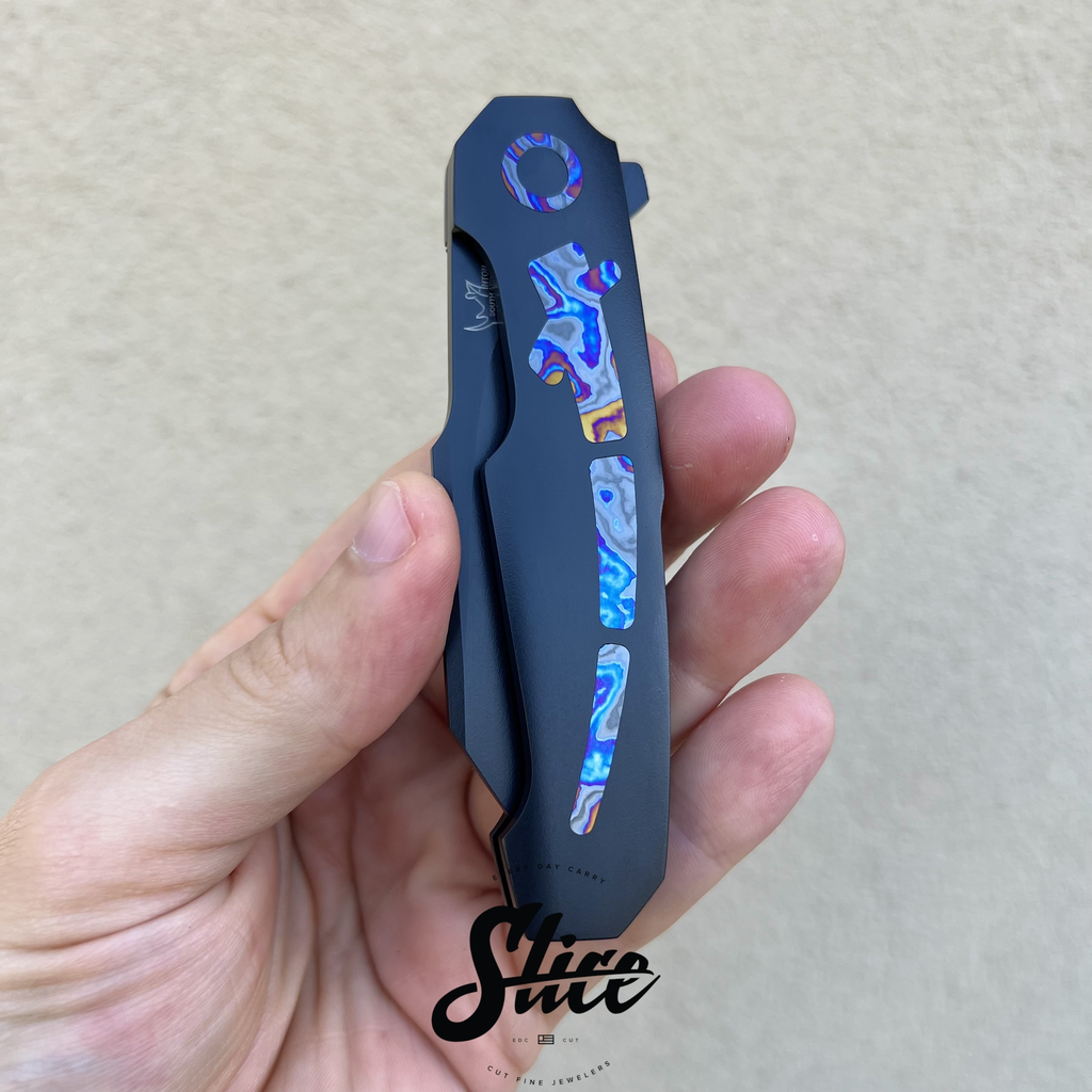 Scales/Handle: Cerakoted titanium with three piece black timascus show side inlays