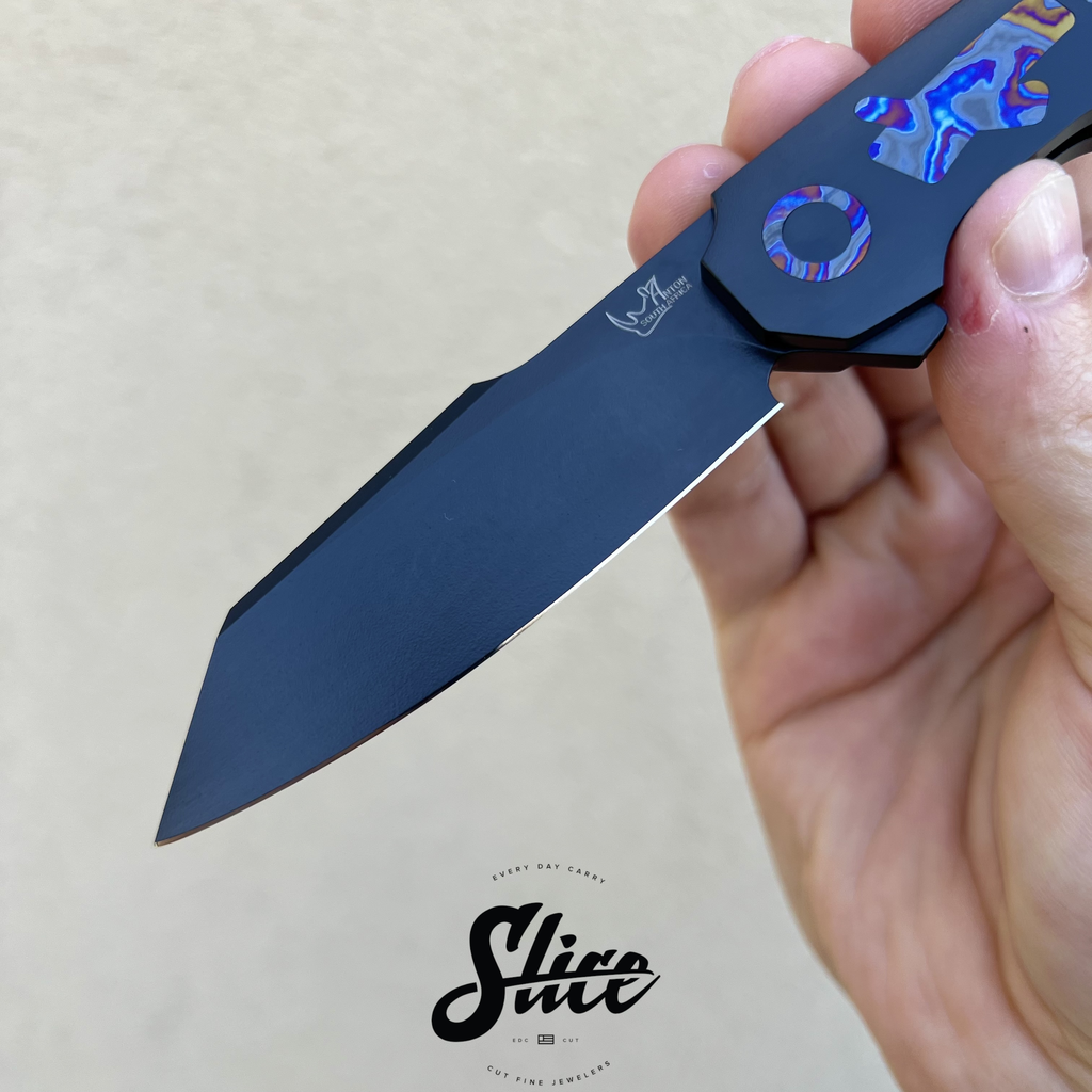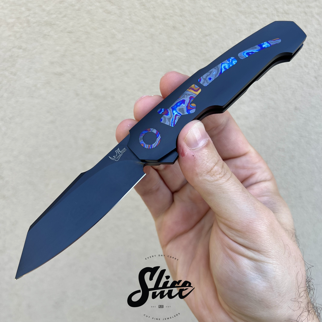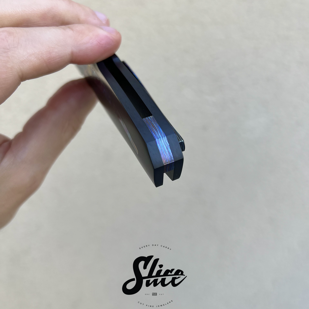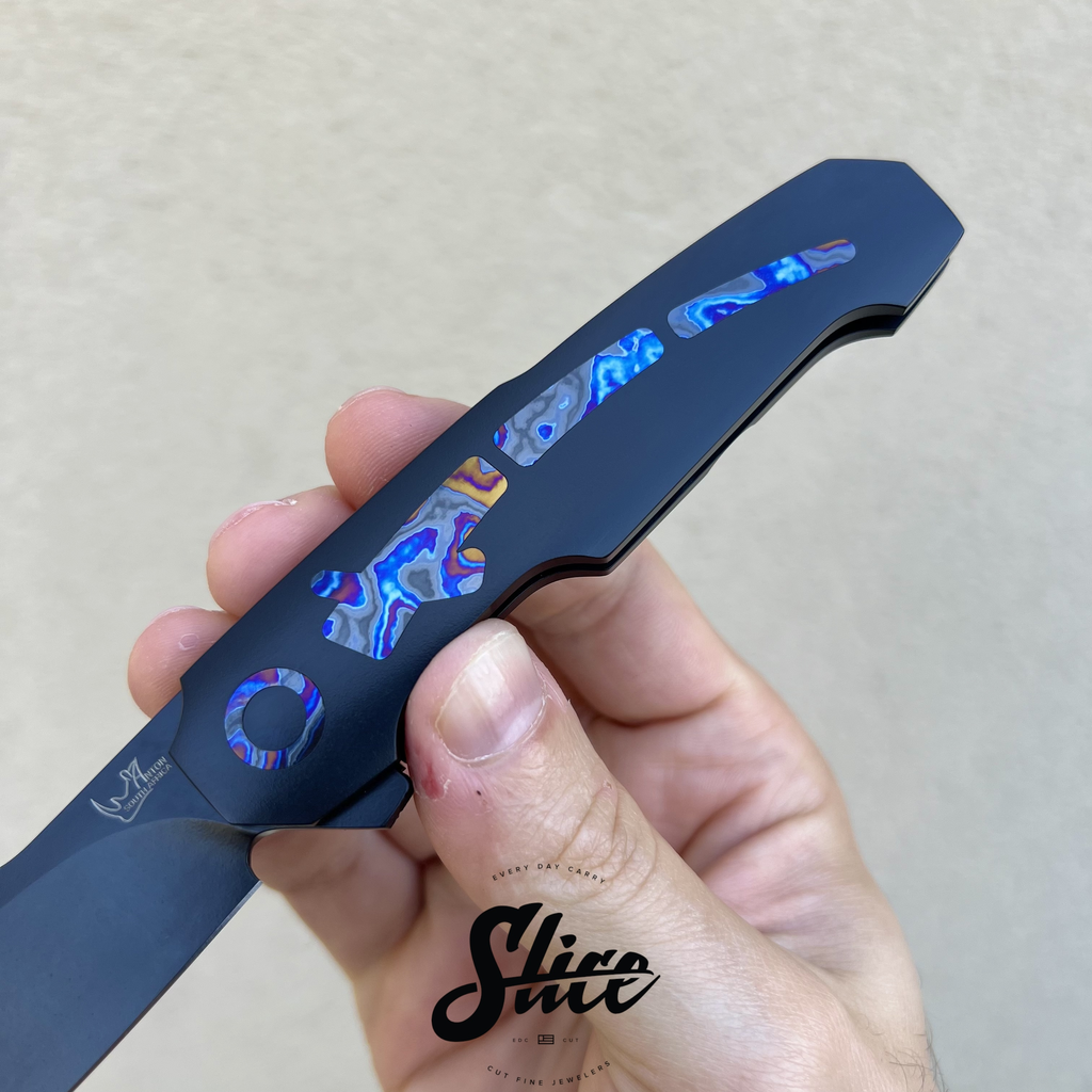 Scales/Handle: Cerakoted titanium with three piece black timascus show side inlays