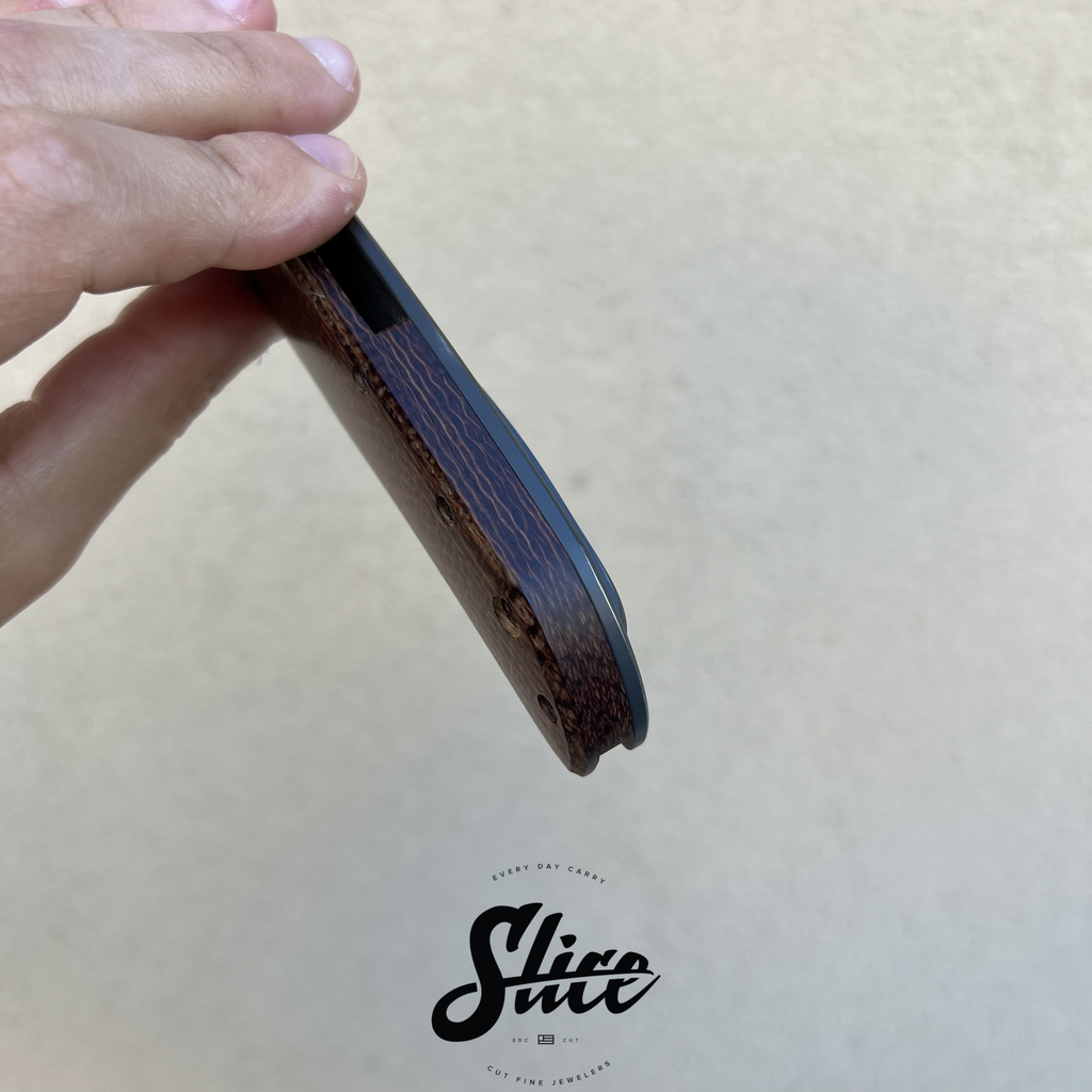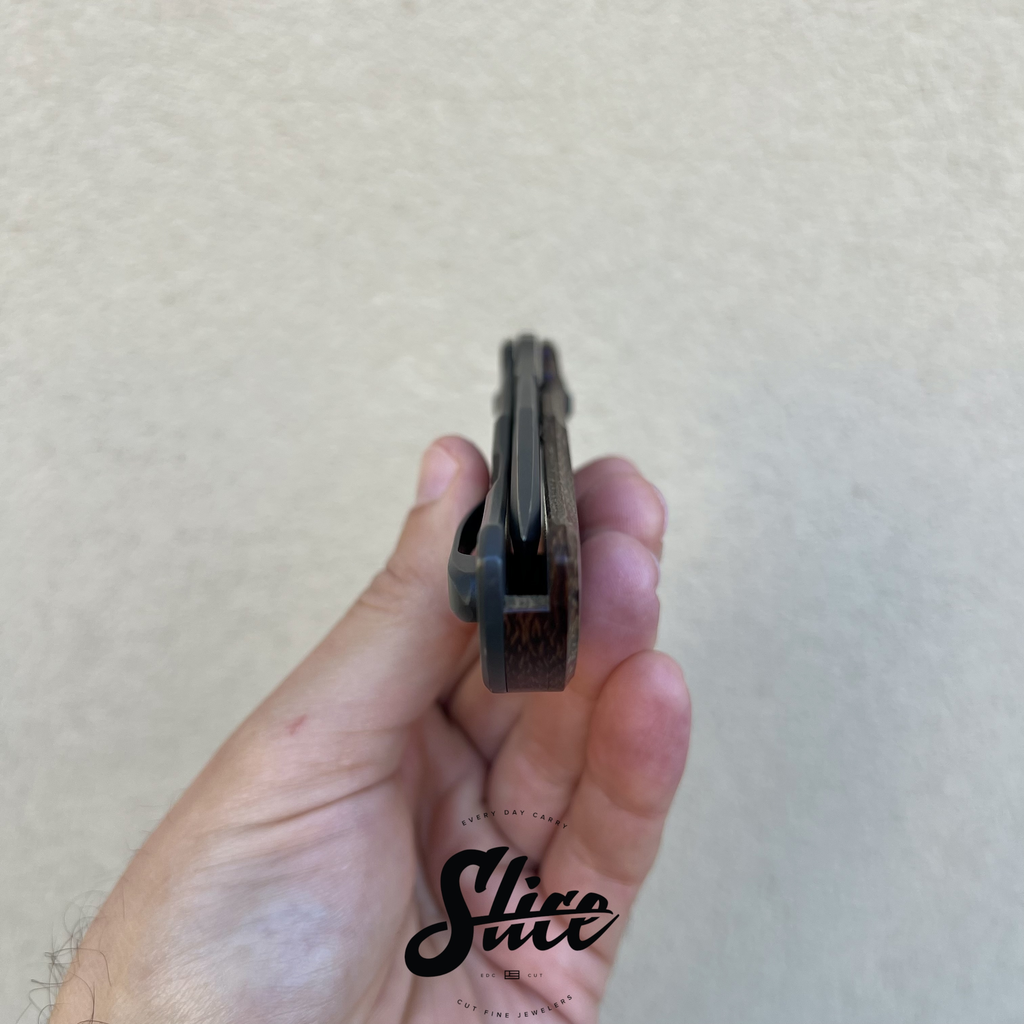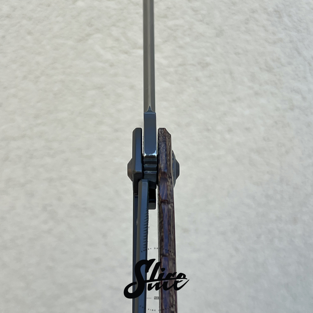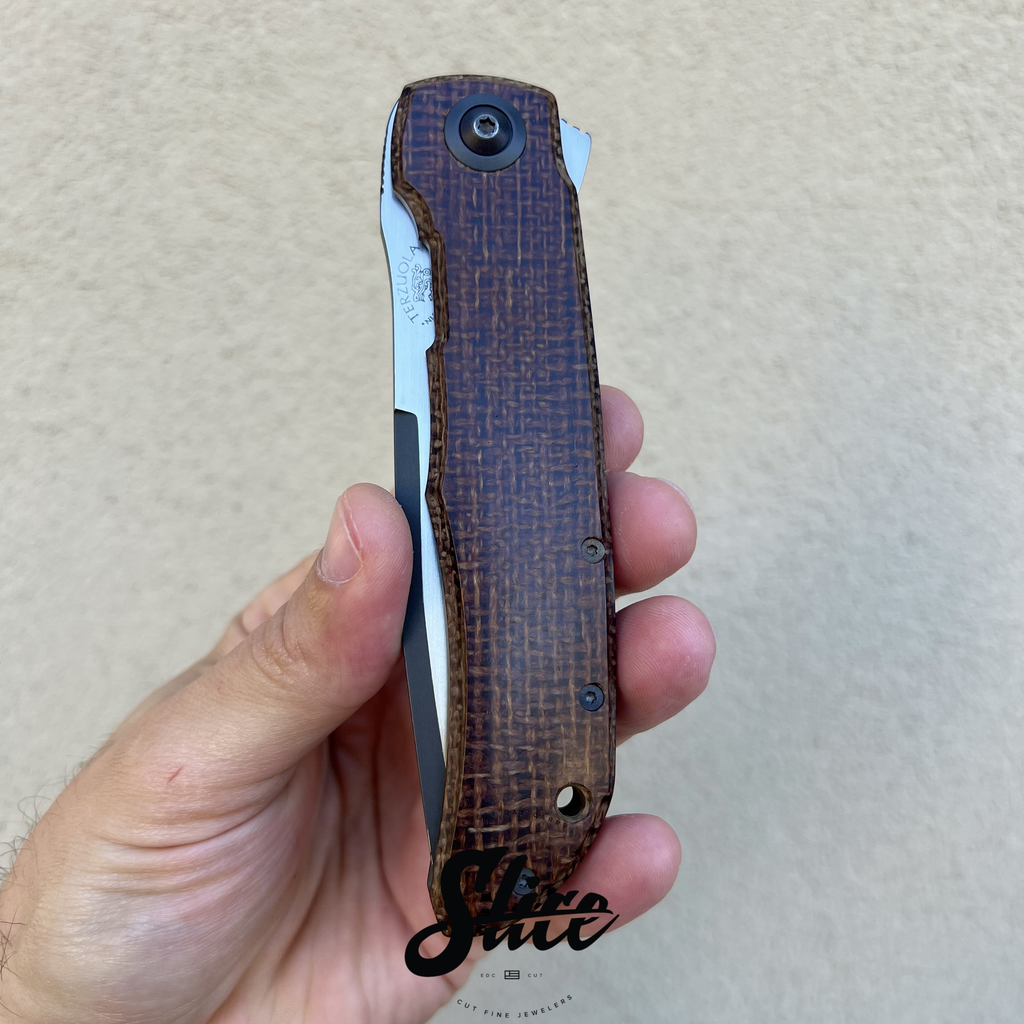 Bob Terzuola ATCF with an acid wash finished blade with hand satin flats, brown micarta show scale and backspacer, darkened titanium lock side and hardware, and zirconium pocket clip.