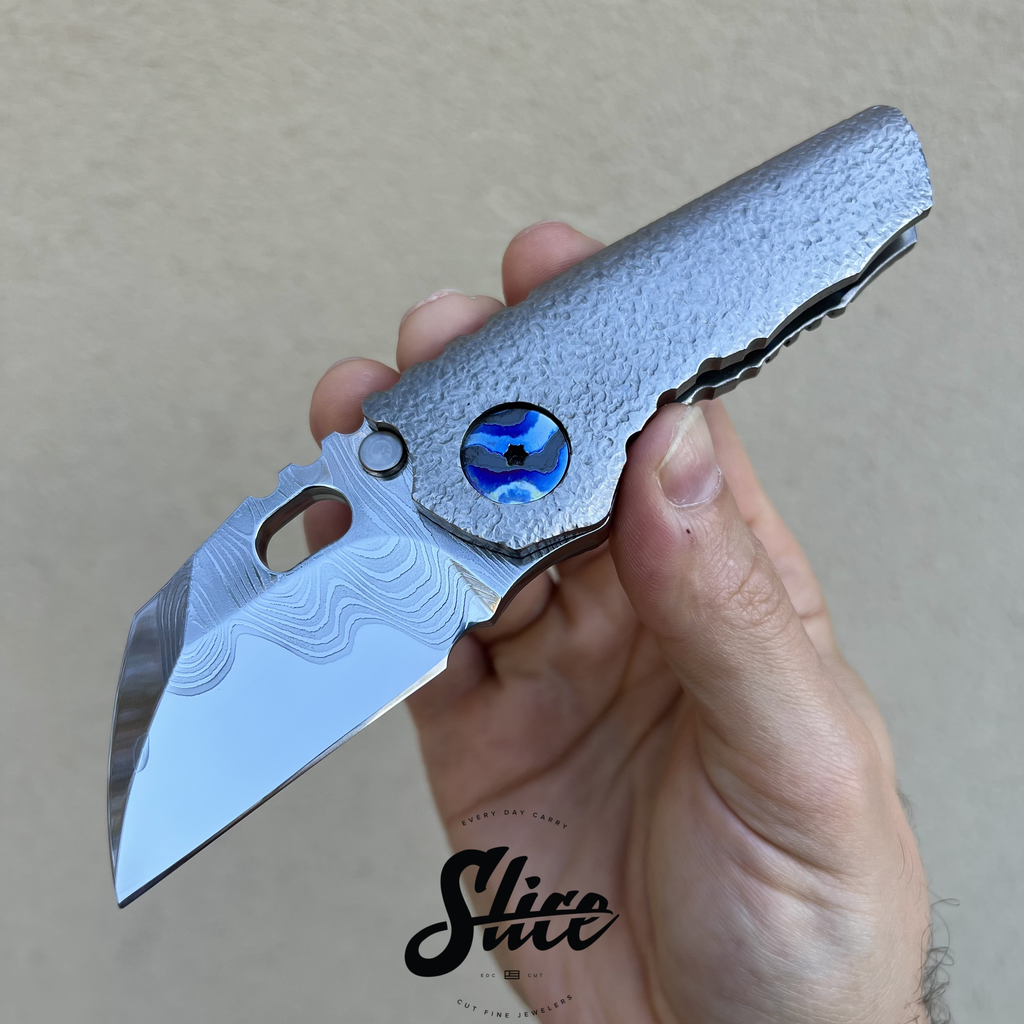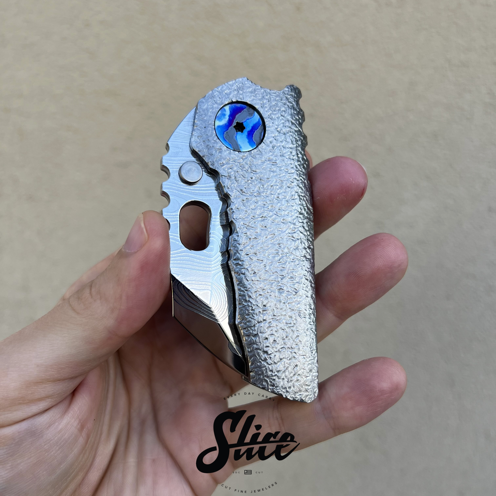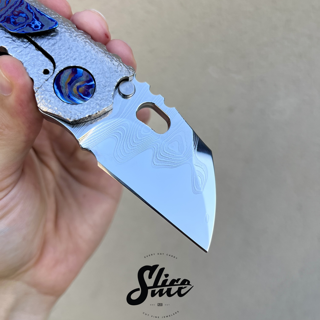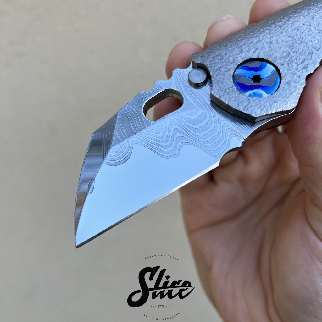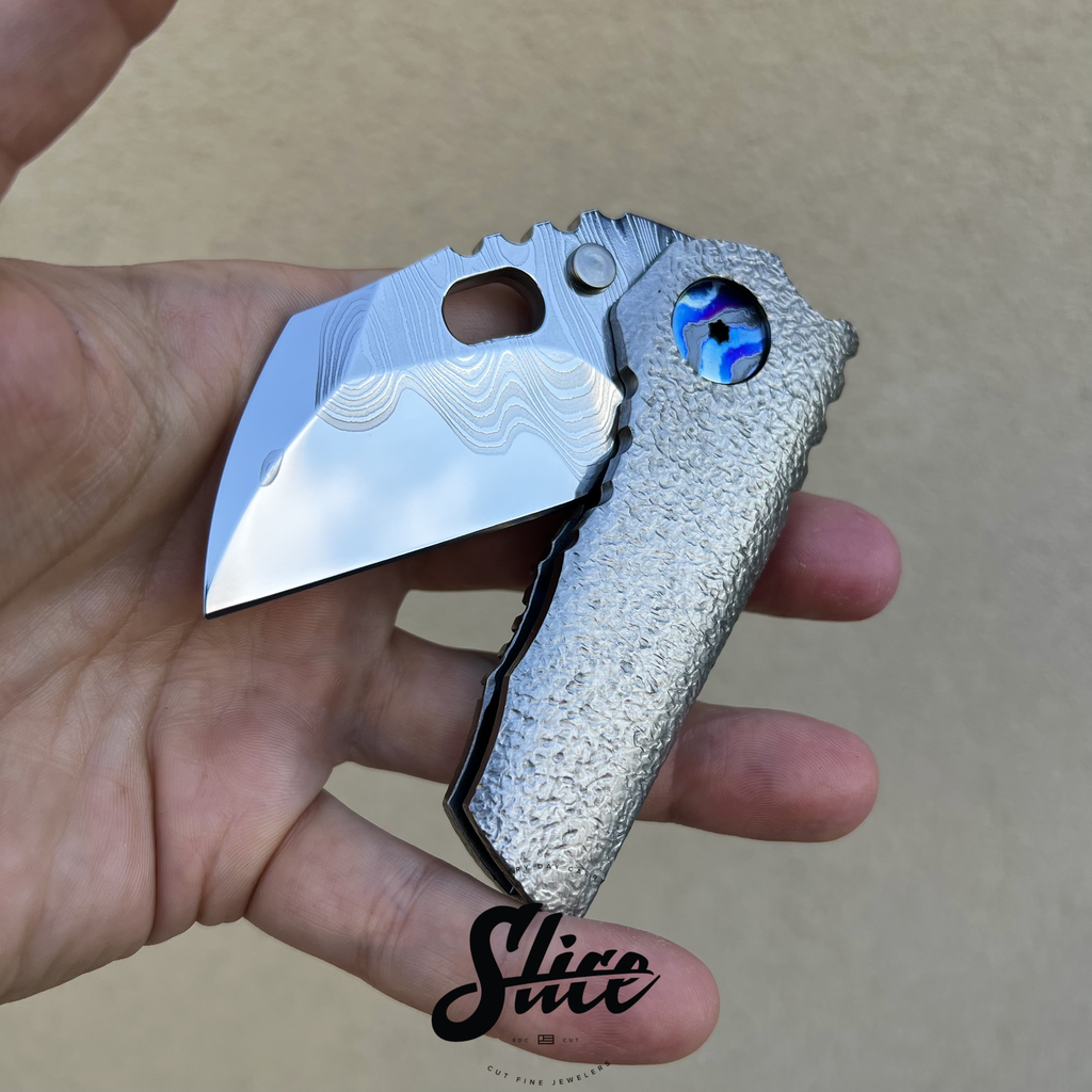 Dalibor Bergam Pollux sole authorship custom folding knife with a sole authorship and mirror polished san mai damascus blade on washers, textured titanium integral handle, and sole authorship titanium damascus pocket clip and pivot screws.