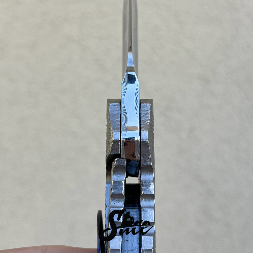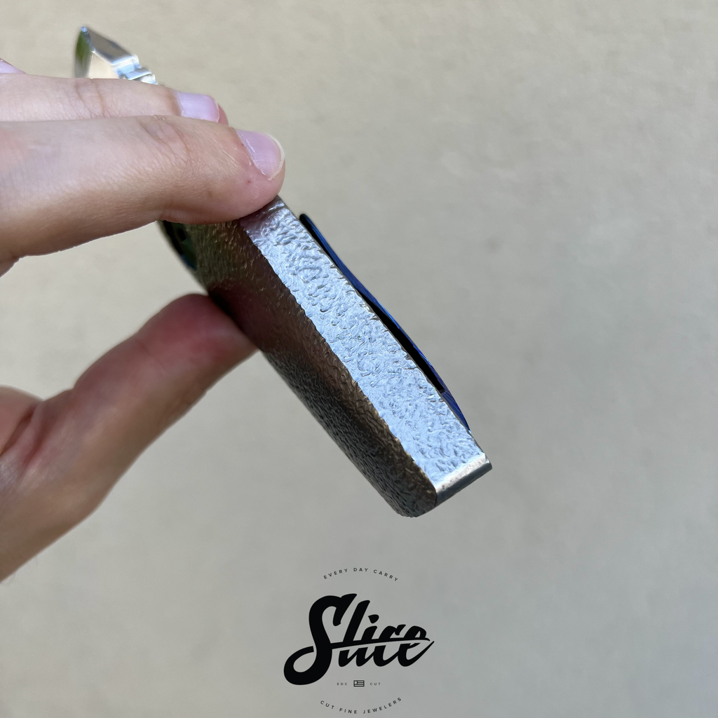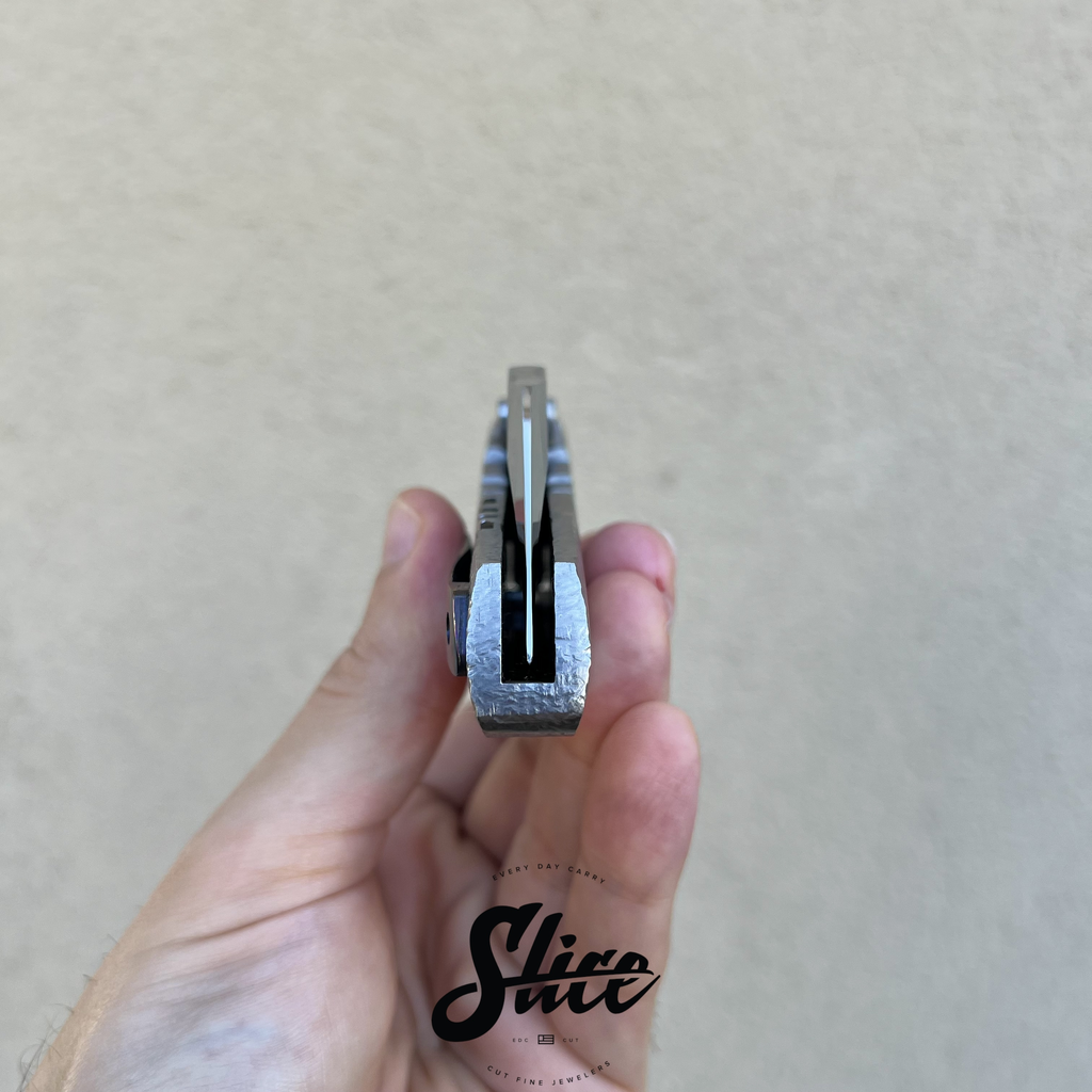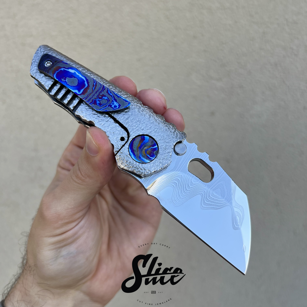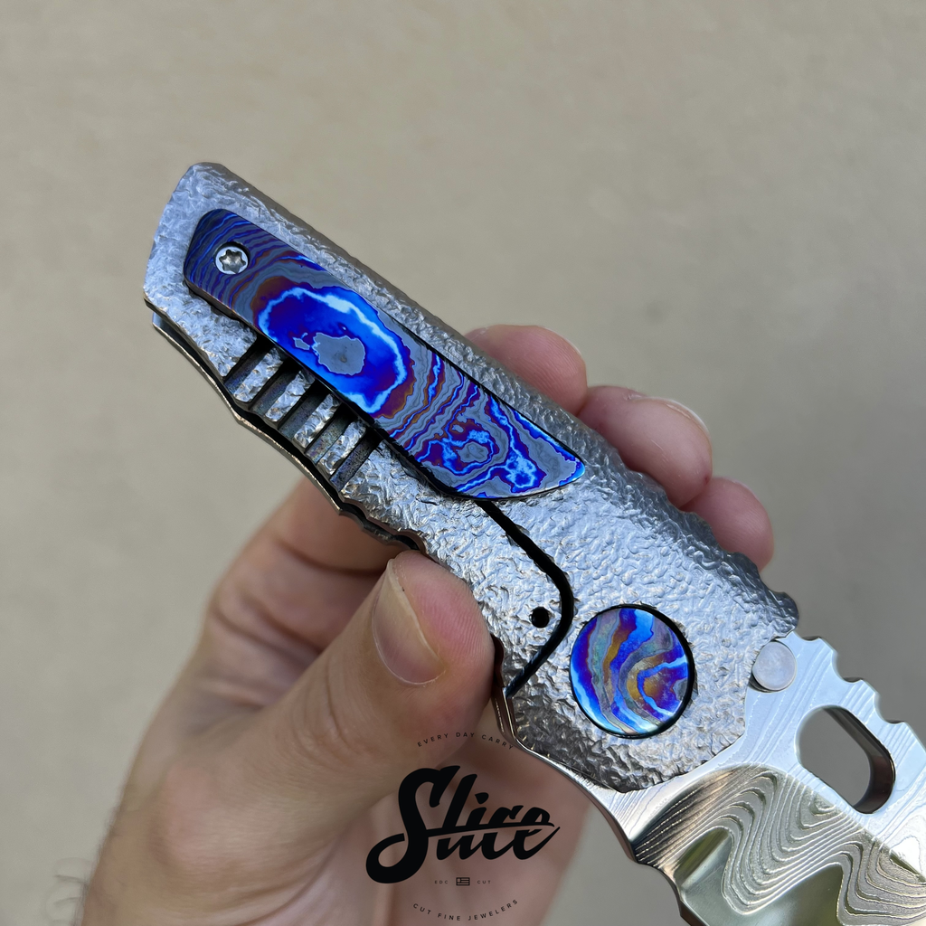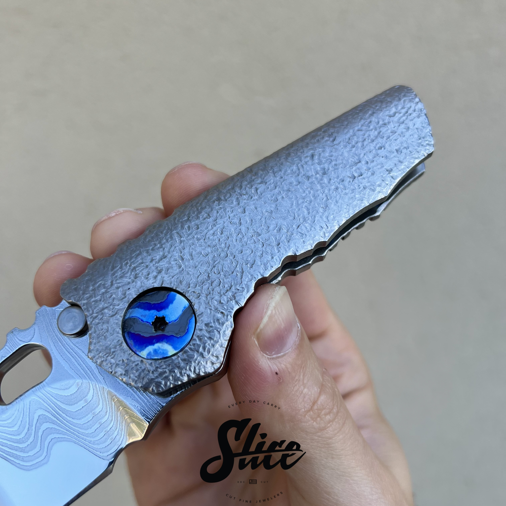 Dalibor Bergam Pollux sole authorship custom folding knife with a sole authorship and mirror polished san mai damascus blade on washers, textured titanium integral handle, and sole authorship titanium damascus pocket clip and pivot screws.