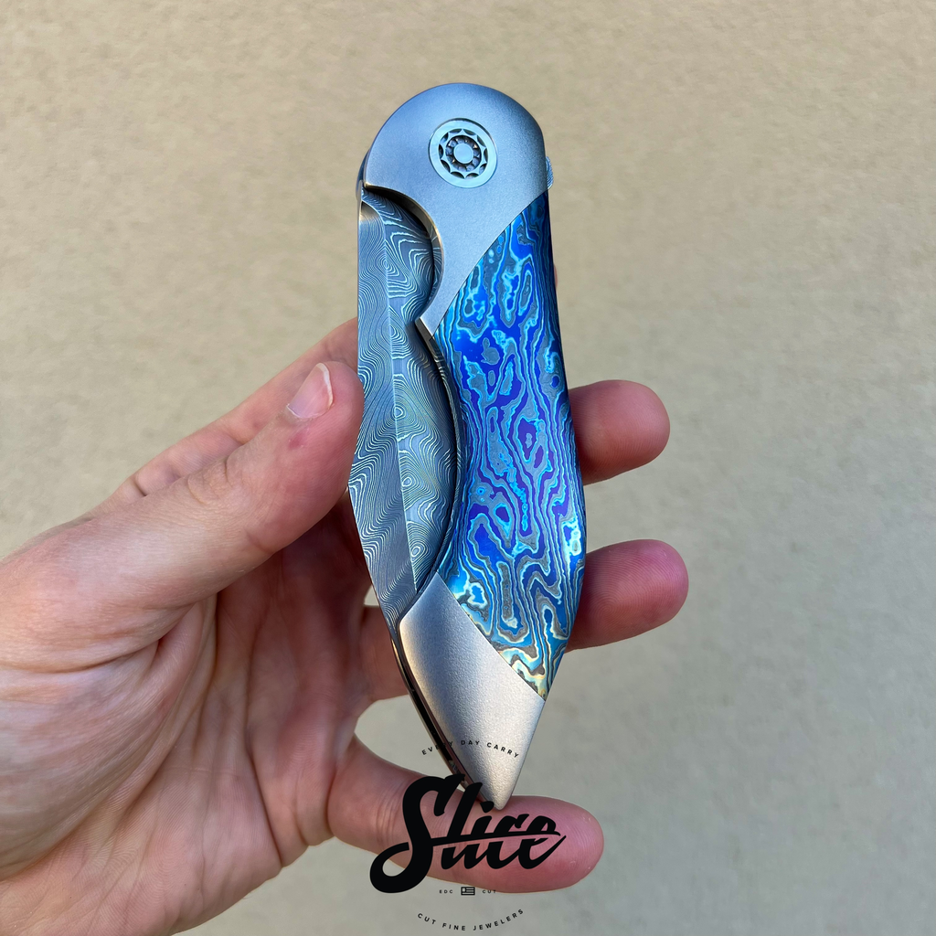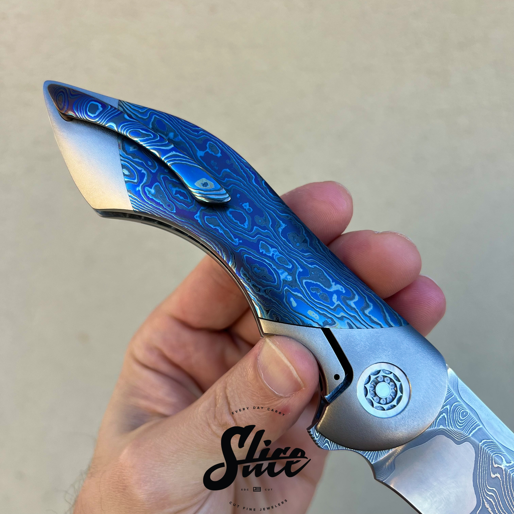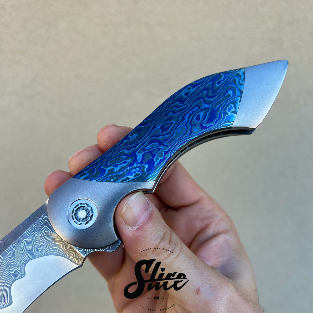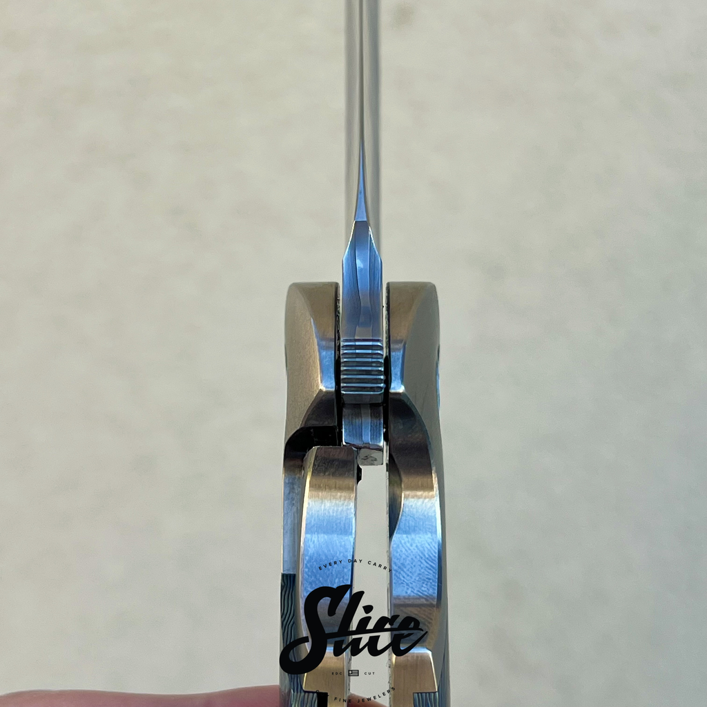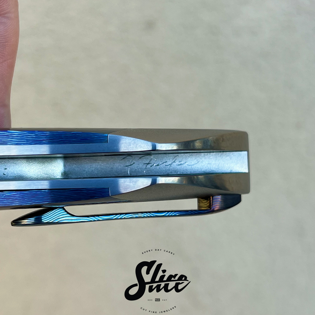 Frank Fischer Battle with a san mai damascus blade with a satin finished core and riding on bearings, heavily contoured titanium handles (bolster-lock) in an eggshell finish, zircuti scales assembled with hidden hardware, matching zircuti pocket clip, "geared" style satin finished titanium backspacer, and Frank's signature 10 point pivots with mother of pearl inlays and pivot collars.