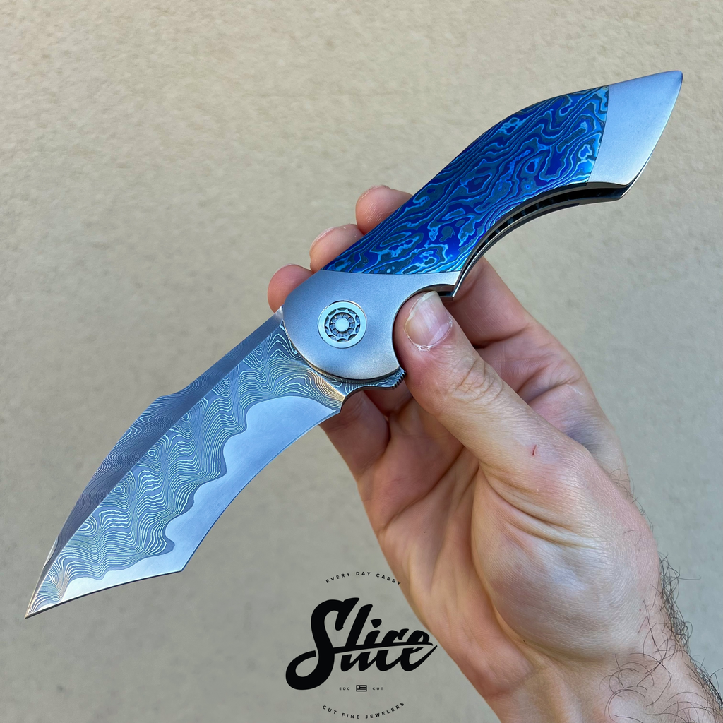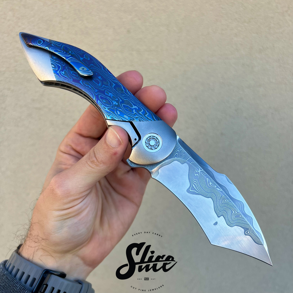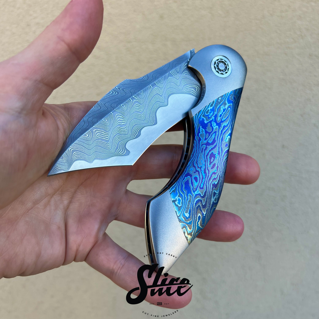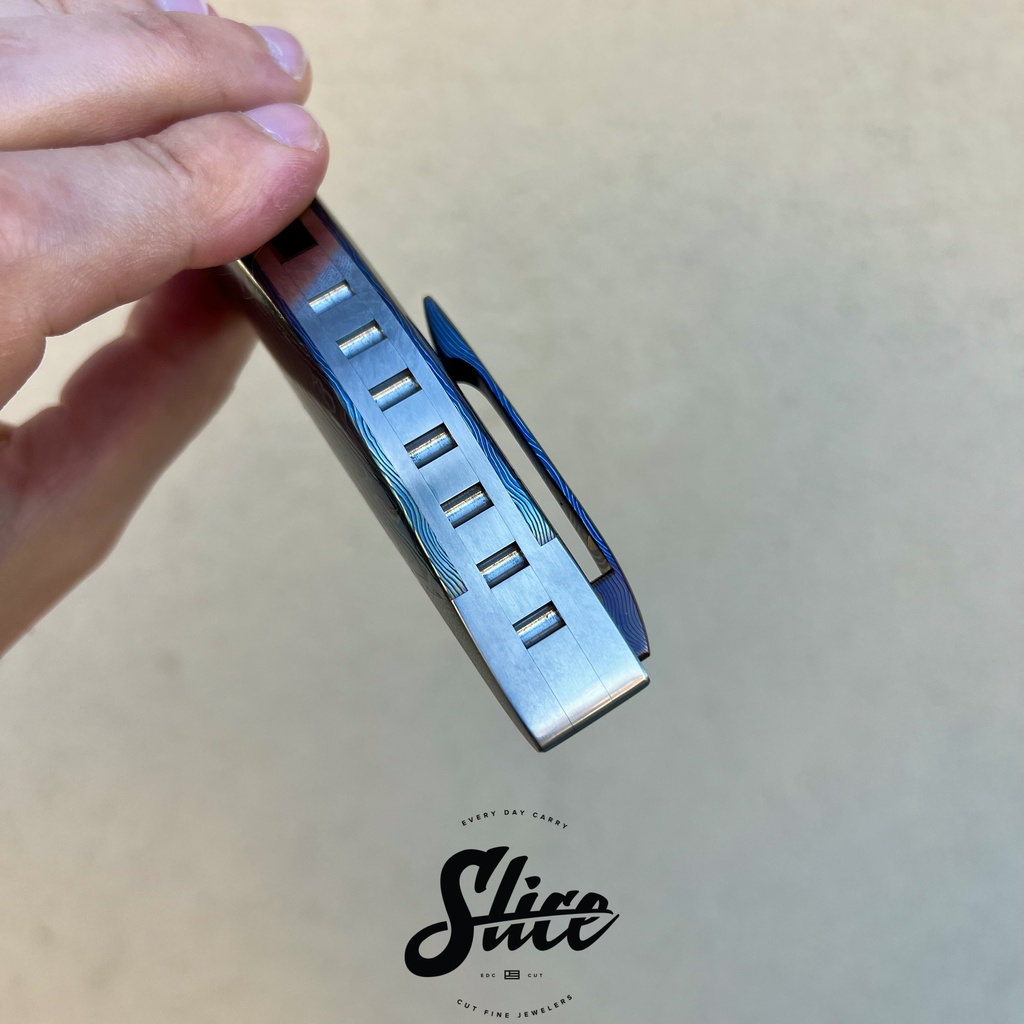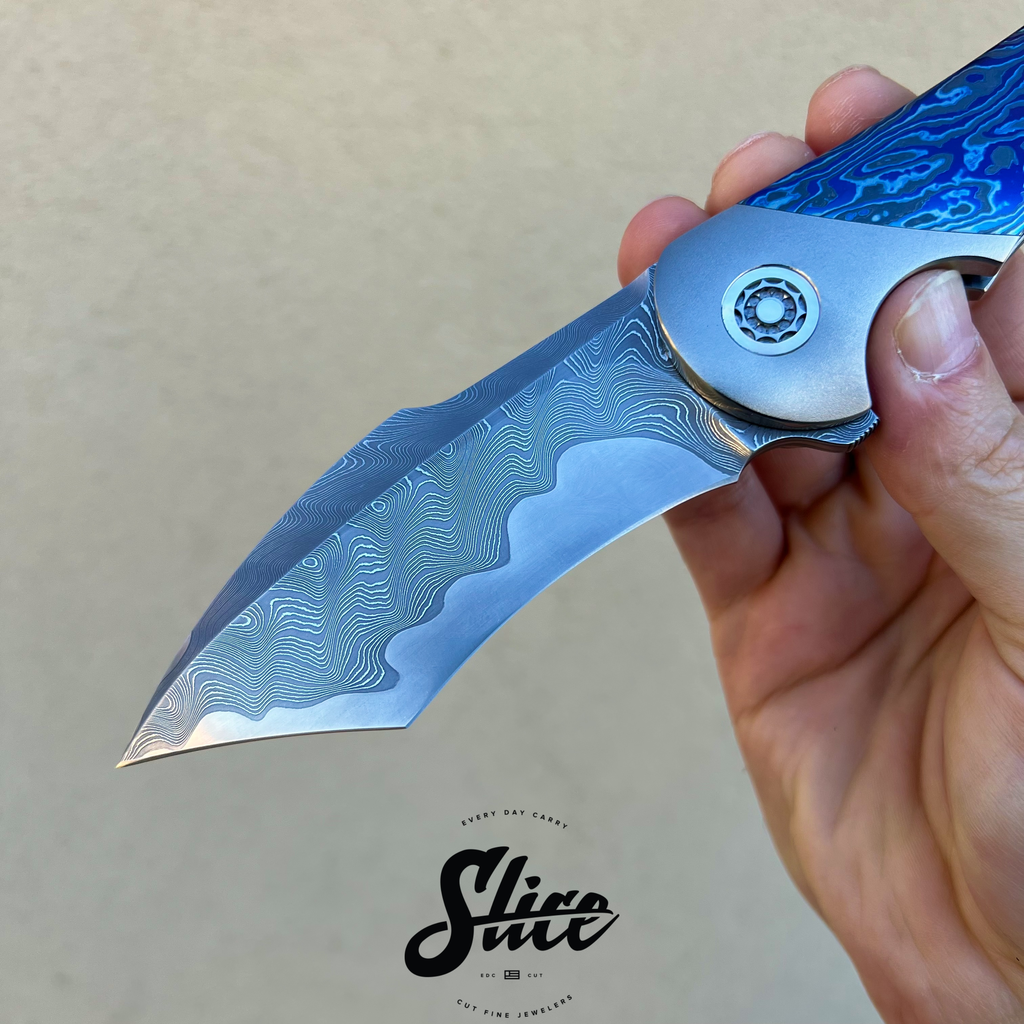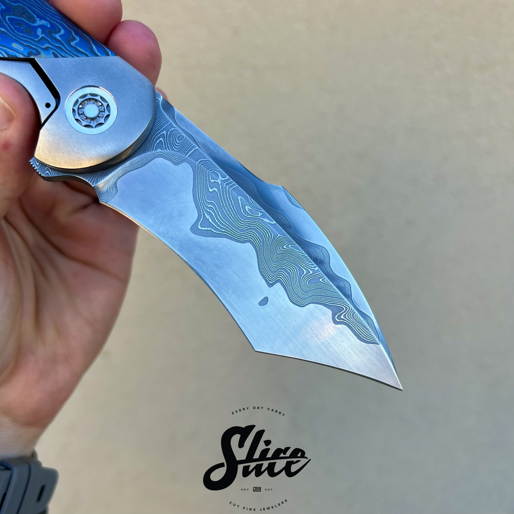 Frank Fischer Battle with a san mai damascus blade with a satin finished core and riding on bearings, heavily contoured titanium handles (bolster-lock) in an eggshell finish, zircuti scales assembled with hidden hardware, matching zircuti pocket clip, "geared" style satin finished titanium backspacer, and Frank's signature 10 point pivots with mother of pearl inlays and pivot collars.