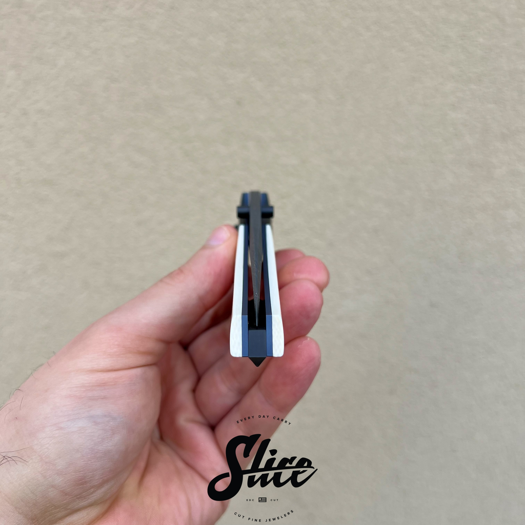 Jeremy Marsh Chisel liner lock with a beautiful dark etched Mike Norris damascus blade, blasted zirconium bolsters and pocket clip, and beveled zirconium backspacer.