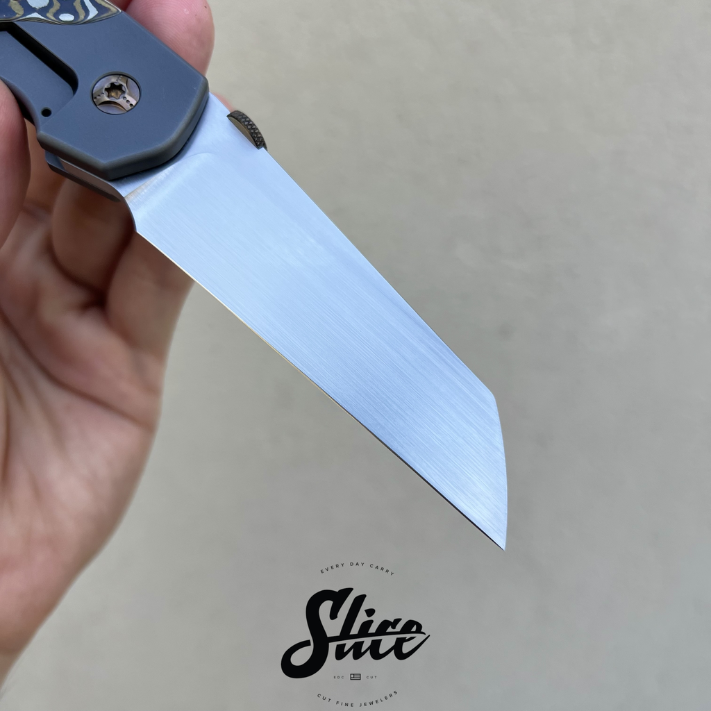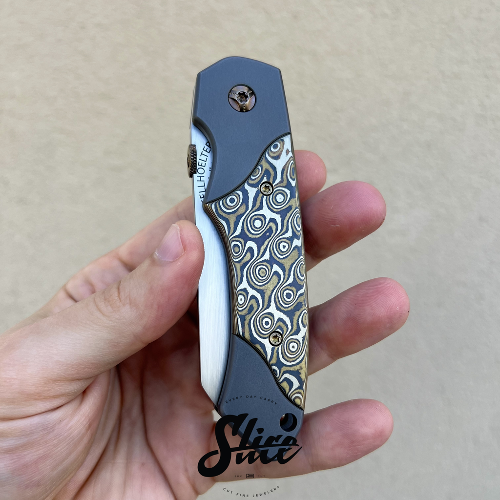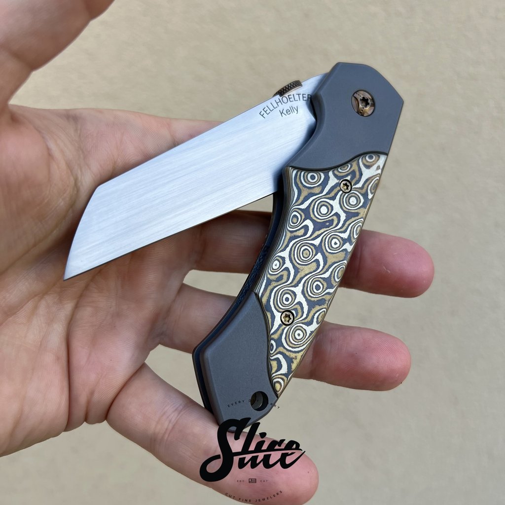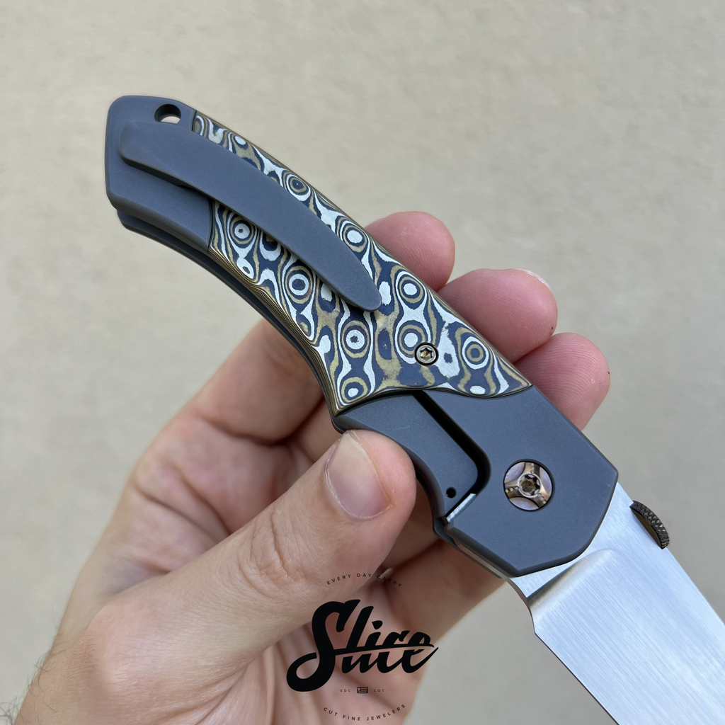 Kelly Fellhoelter Confluence bolster lock with a hand rubbed satin blade, blasted double bolster titanium handles and pocket clip, mokume scales, and anodized titanium hardware and standoffs.
