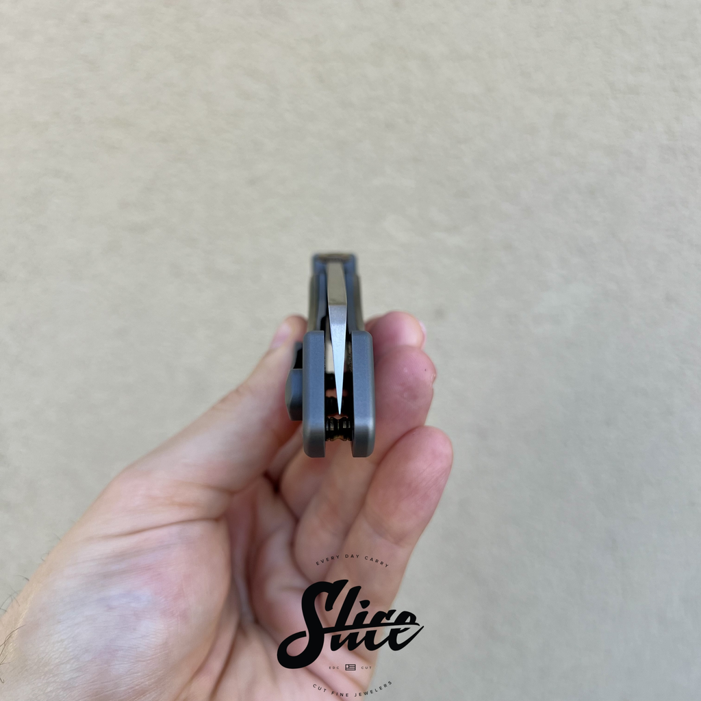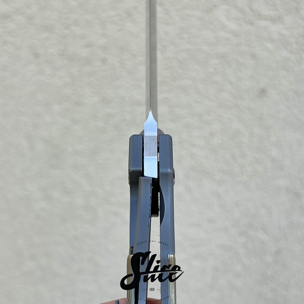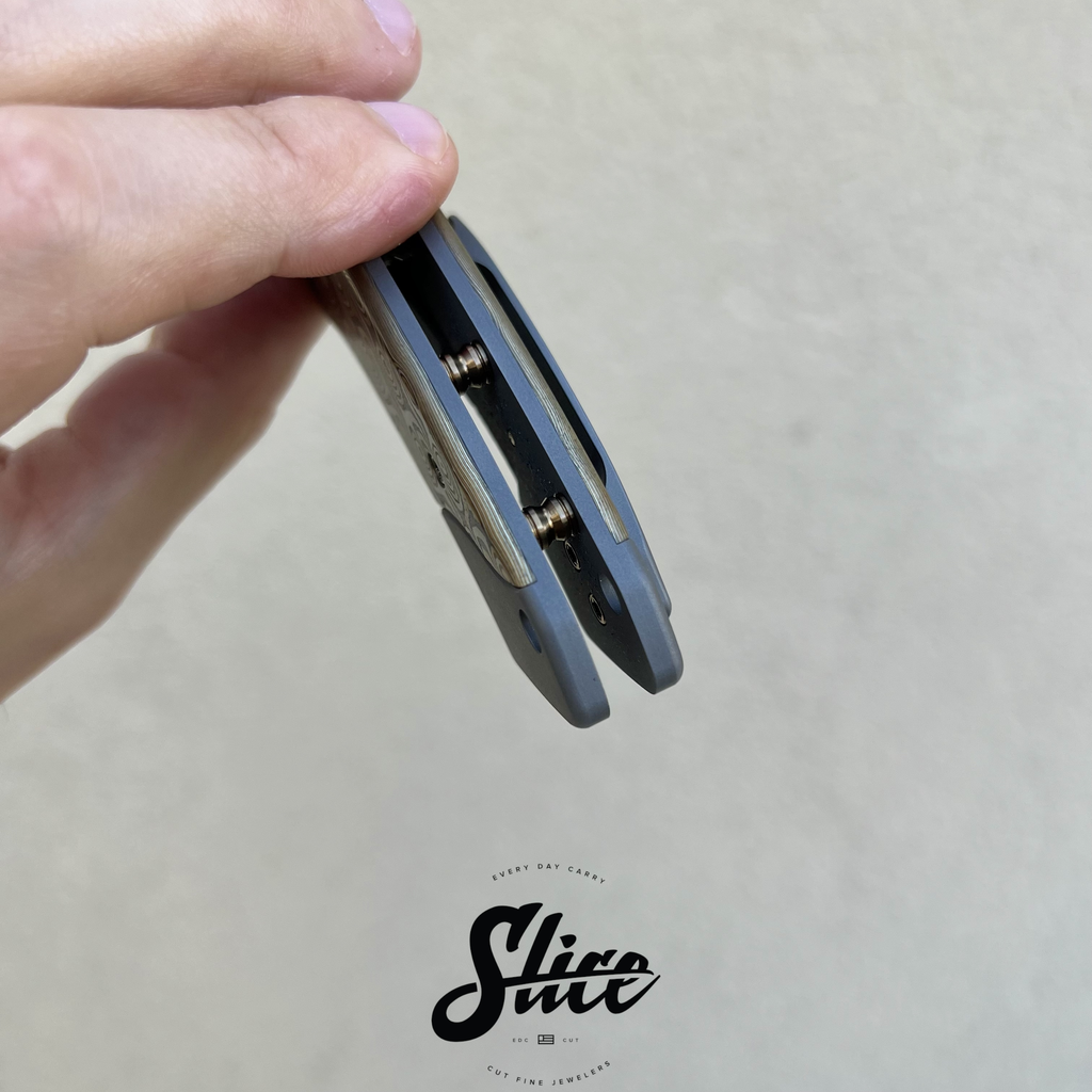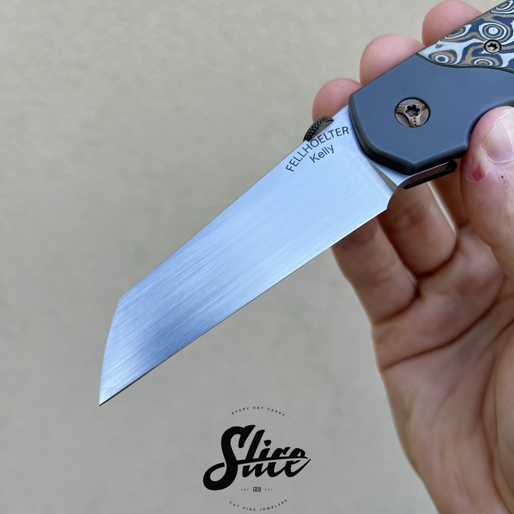 Kelly Fellhoelter Confluence bolster lock with a hand rubbed satin blade, blasted double bolster titanium handles and pocket clip, mokume scales, and anodized titanium hardware and standoffs.