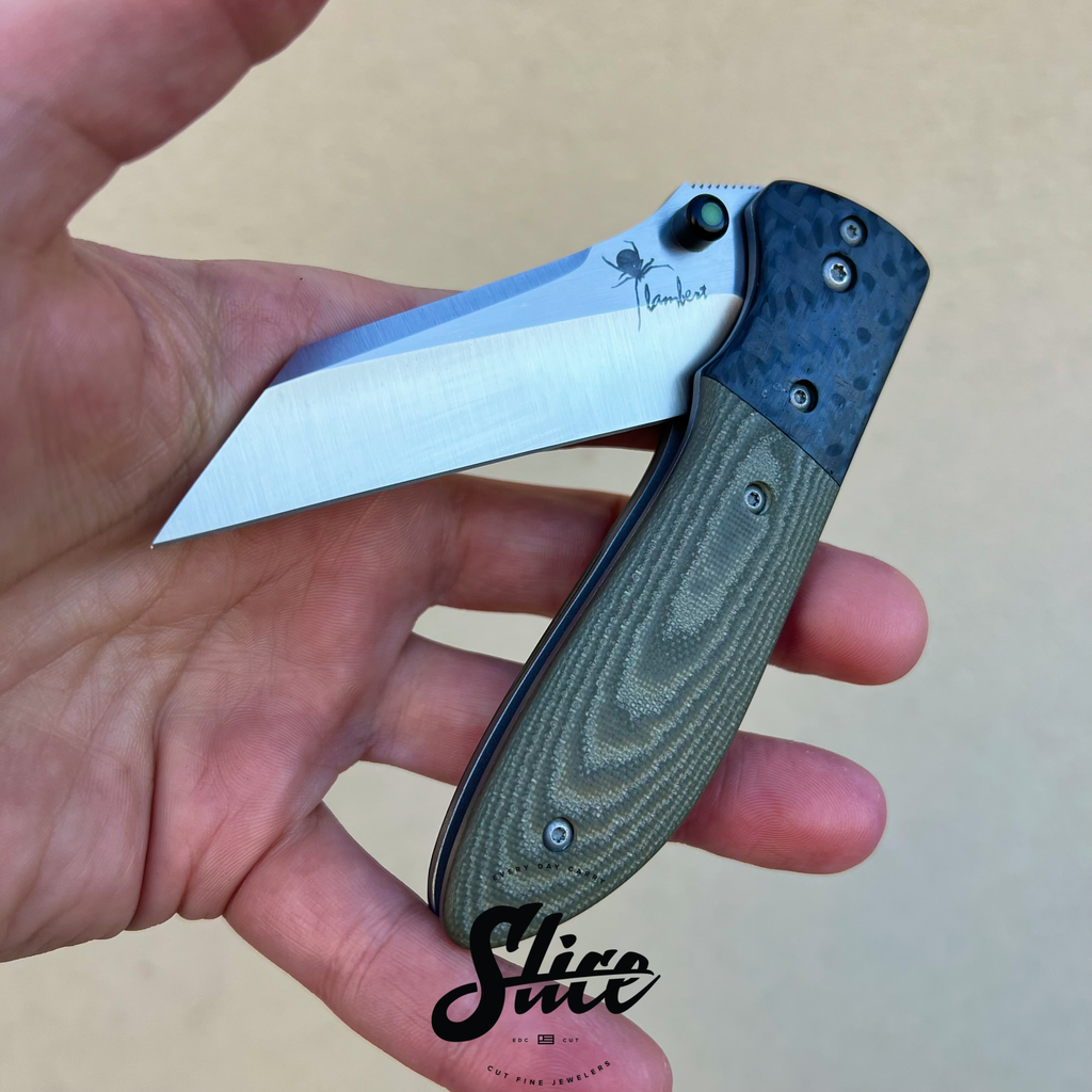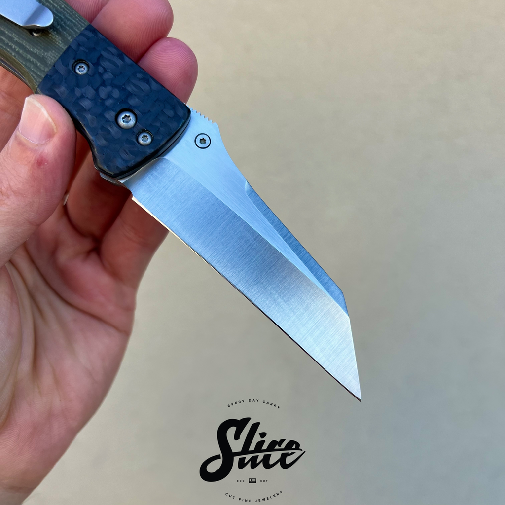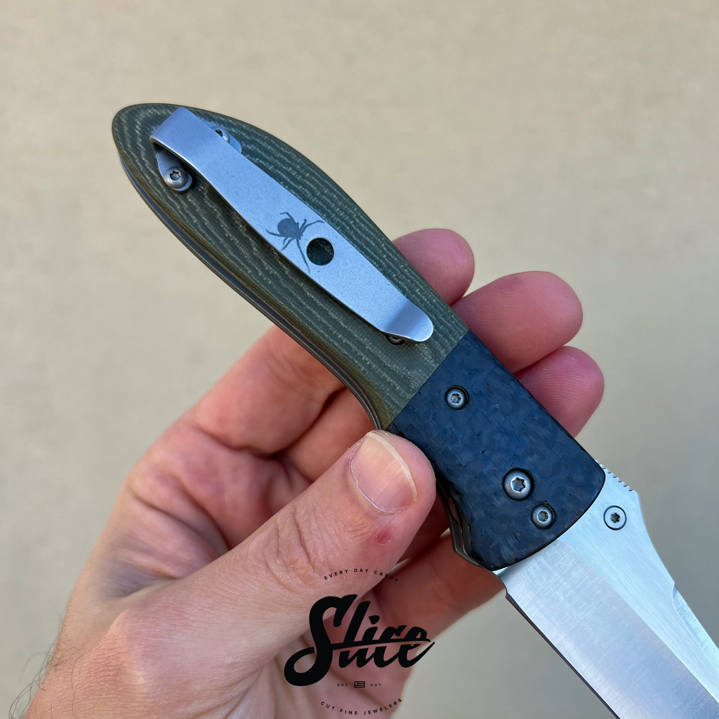 Kirby Lambert Whar with a belt satin finished blade on washers, carbon fiber bolsters, G10 scales, satin standoffs, and blasted spring style pocket clip.