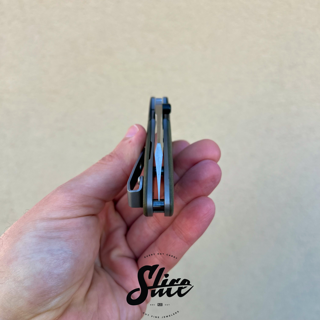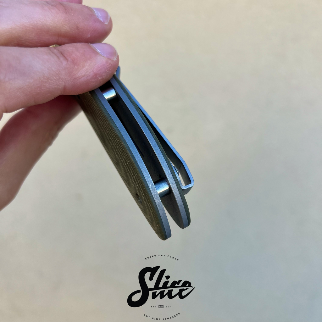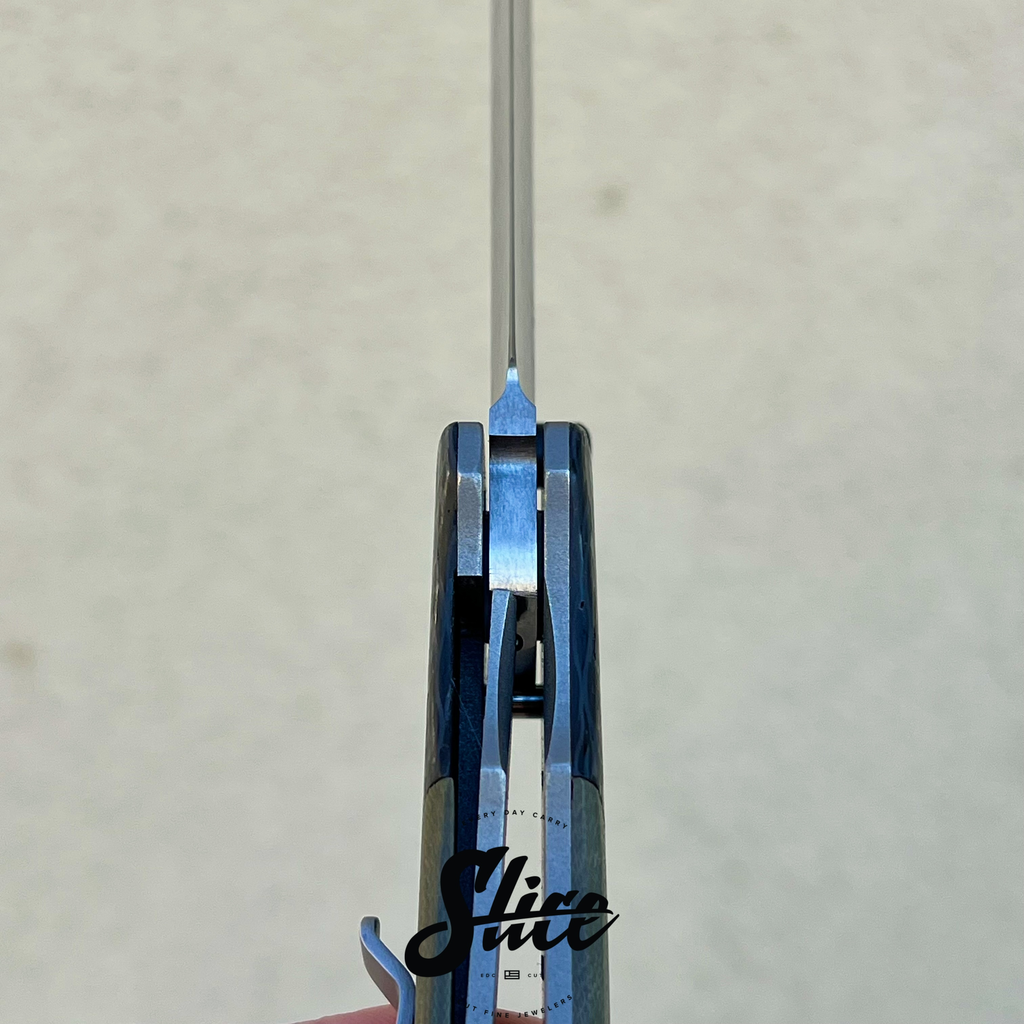 Kirby Lambert Whar with a belt satin finished blade on washers, carbon fiber bolsters, G10 scales, satin standoffs, and blasted spring style pocket clip.