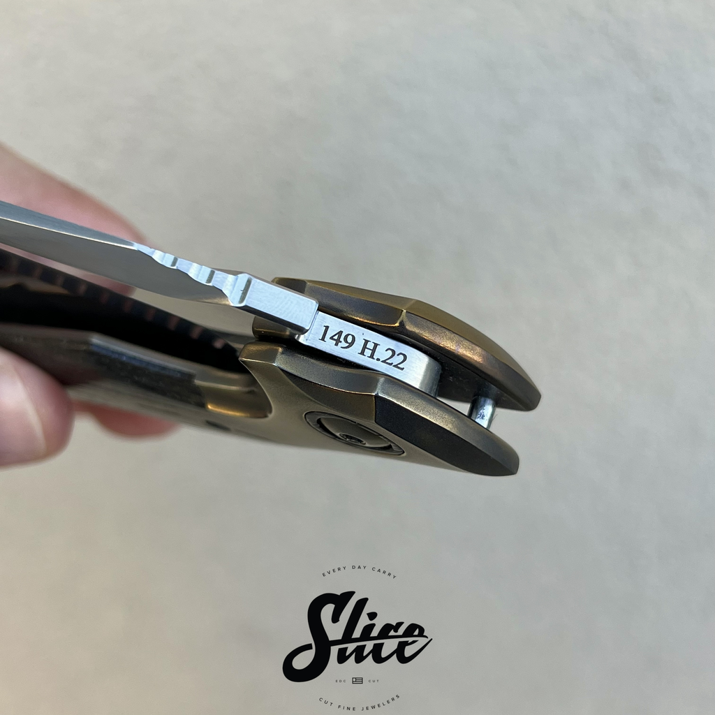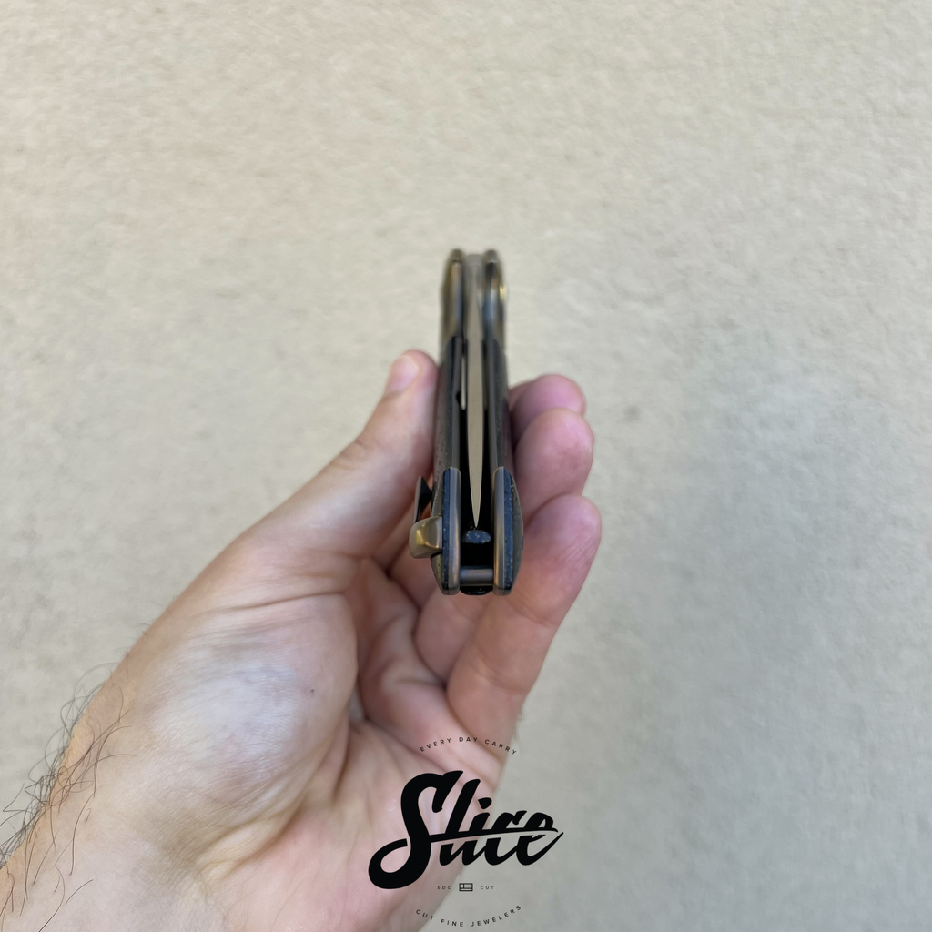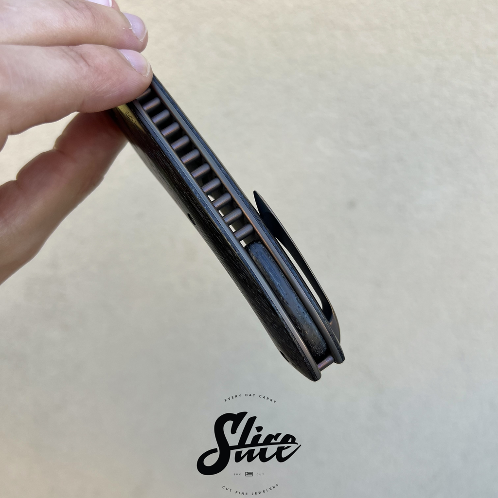 Pivot: bronze anodized titanium with Bog oak wood pivot collars