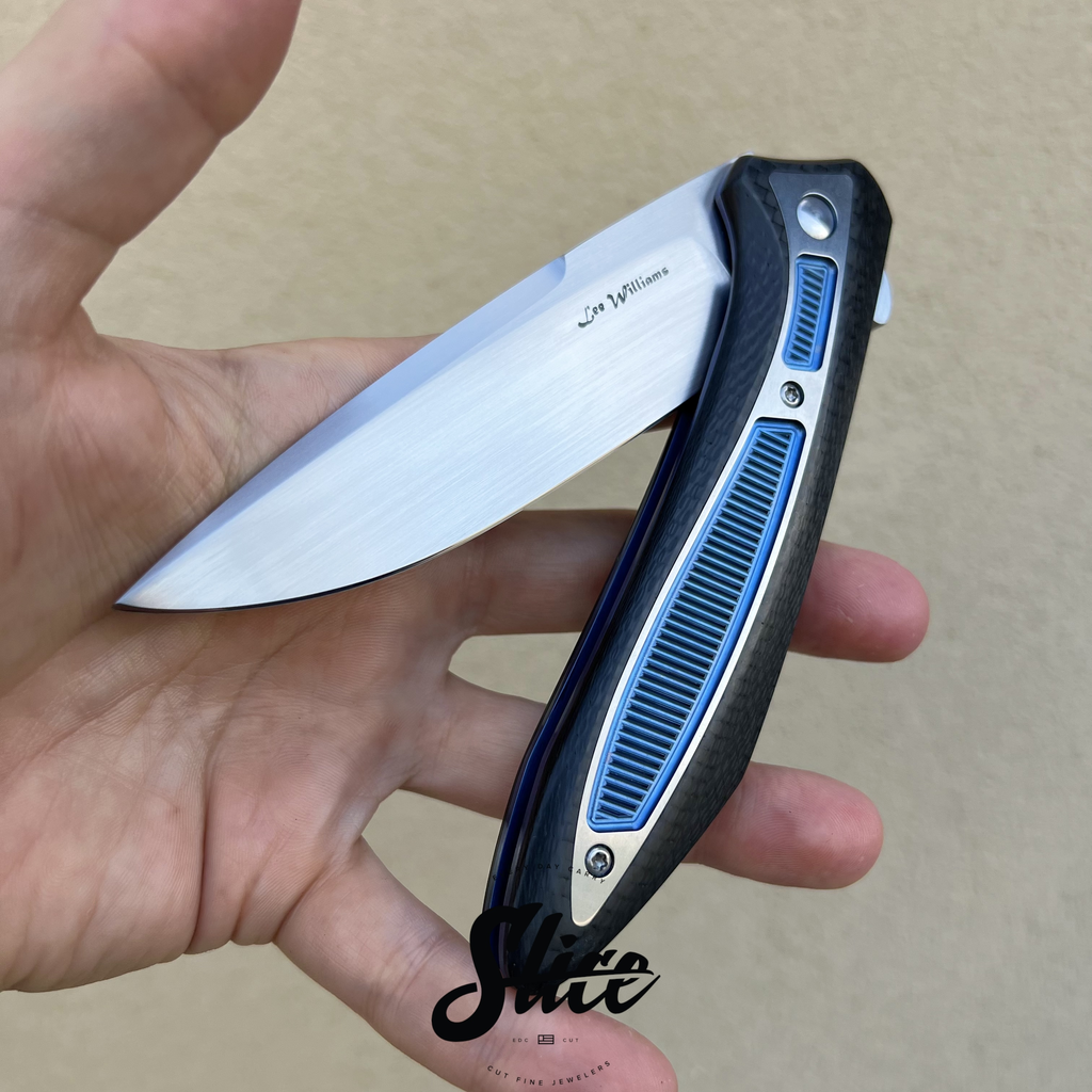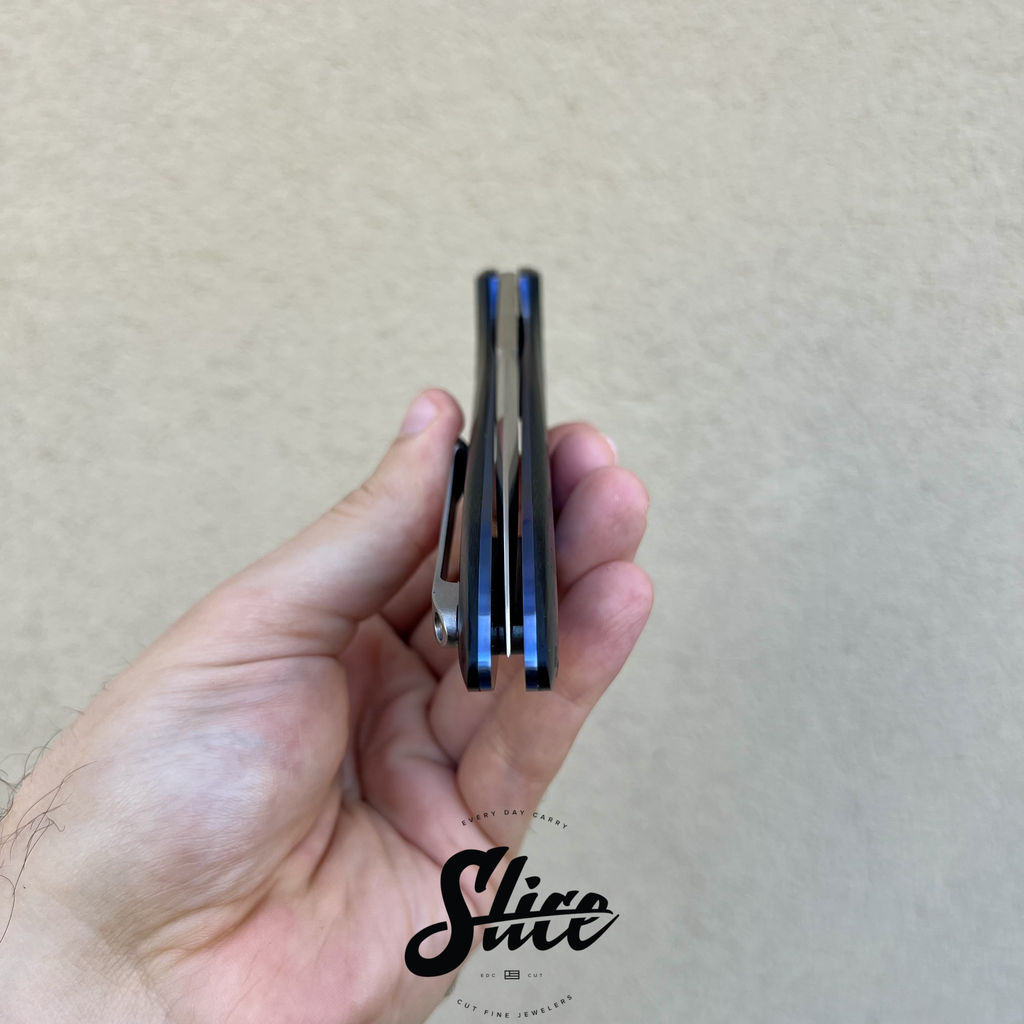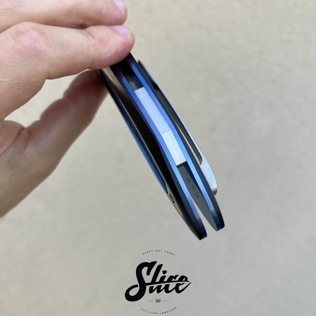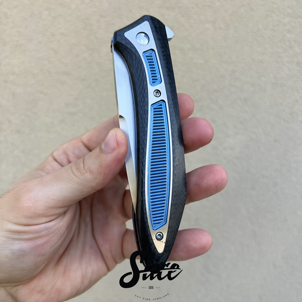 Scales/Handle: carbon fiber scales with milled titanium inlays in satin and anodized finishes