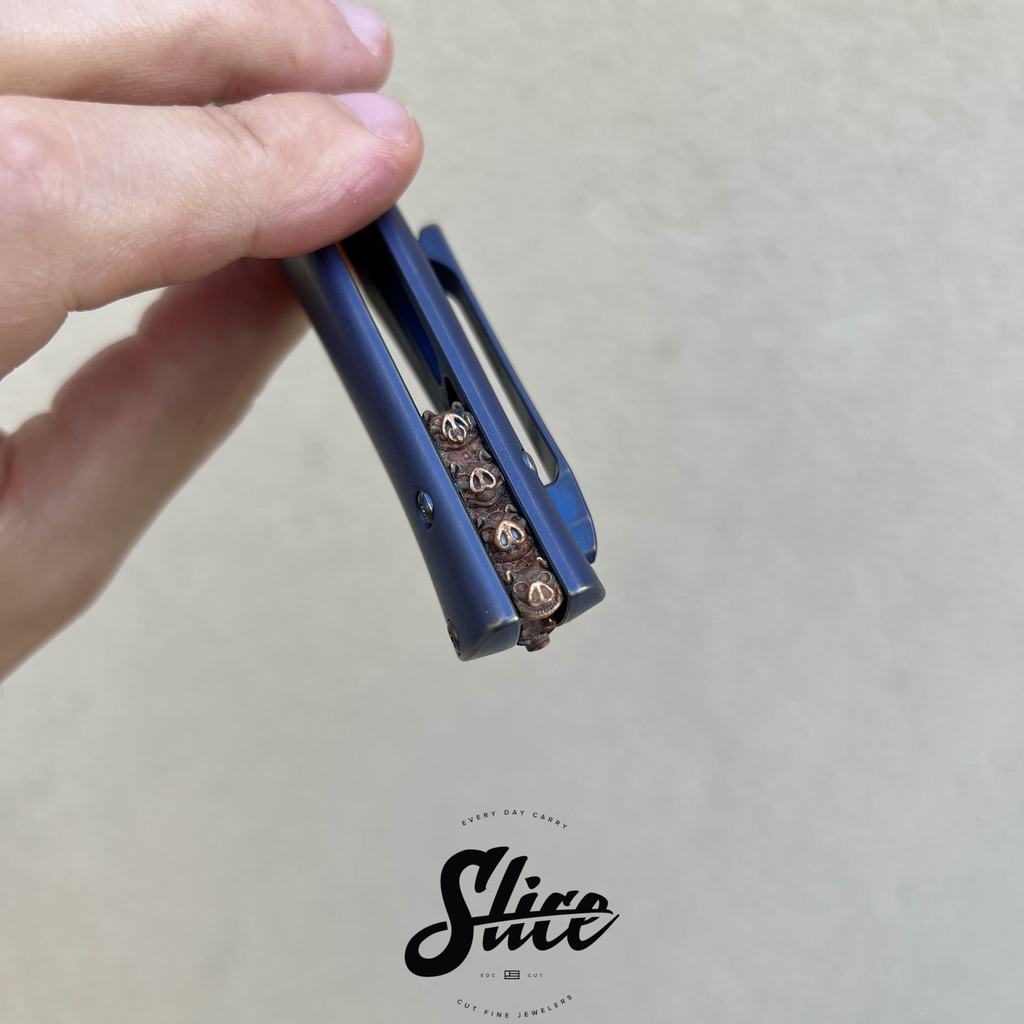 Michael Zieba Mini S5 with a heavy stonewashed blade, "Denim" finished tumbled and anodized titanium handles and pocket clip, and a carved copper pigs backspacer