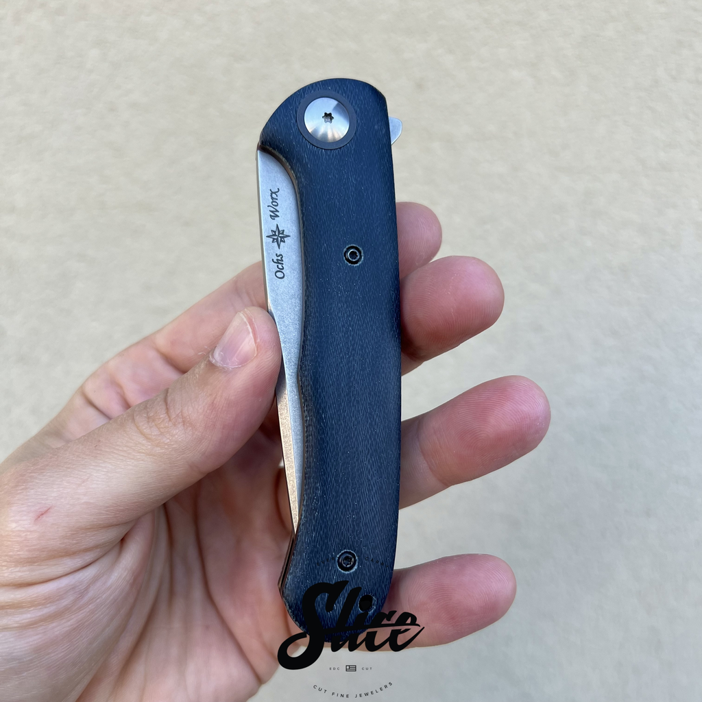 Ochs Worx Tualatin (Eric Ochs) custom folding knife with stonewashed steel and micarta scales.