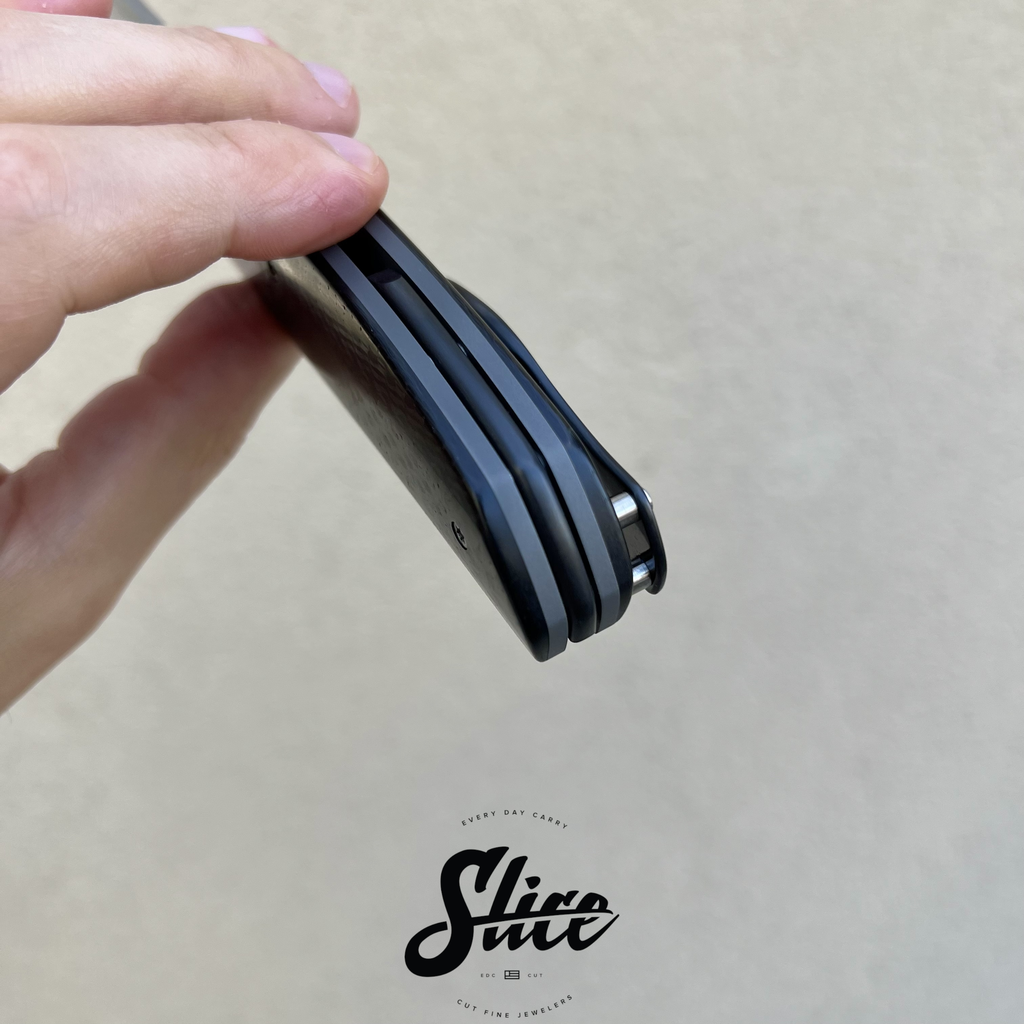 Walter Randolph Mini Cetus (WR Bladeworks) with a hand rubbed satin blade, timascus bolsters, carbon fiber scales, and satin zirconium pocket clip backspacer and pivot collars