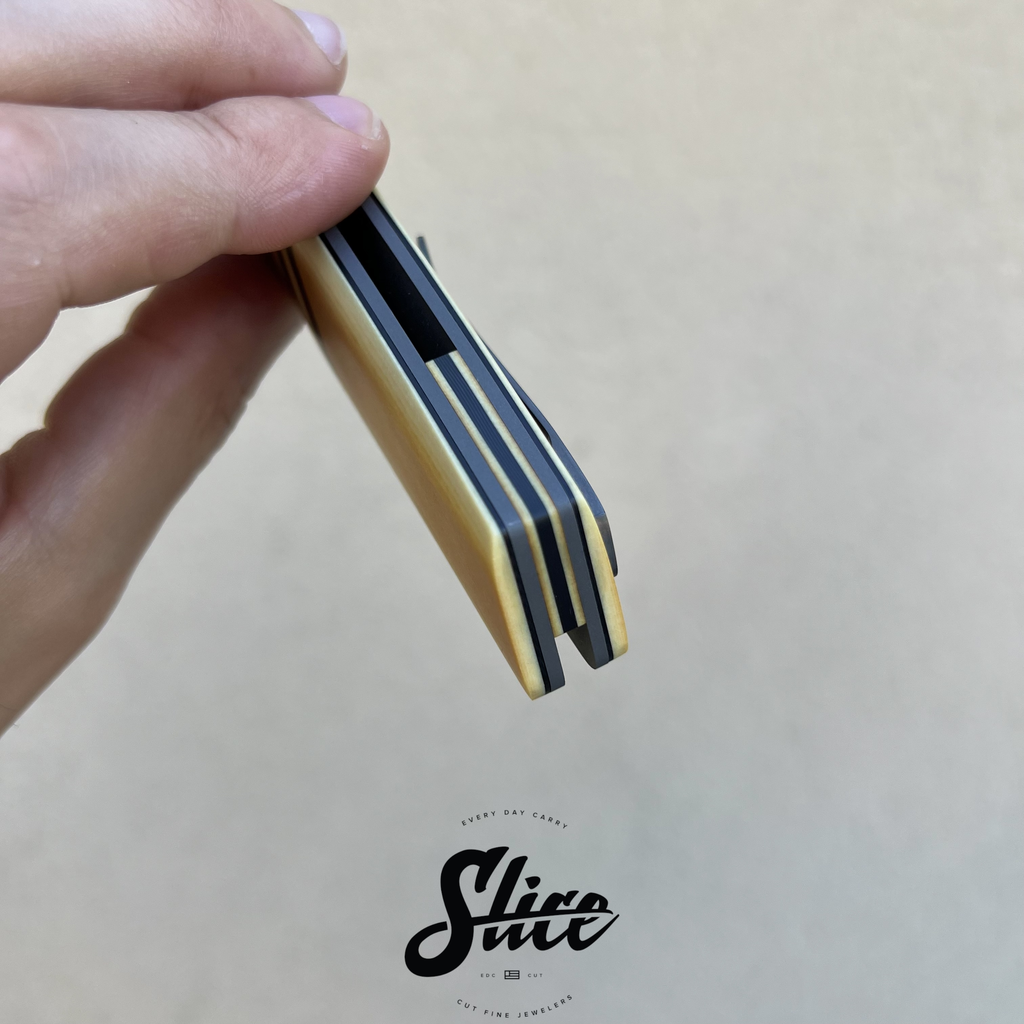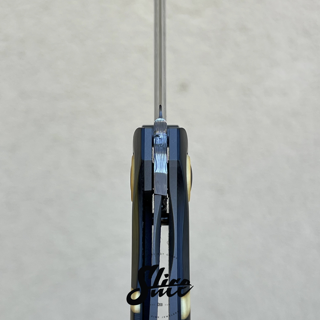 Scales/Handle: Vintage Ivory Micarta with twin CamoCarbon black pearl inlaid stripes