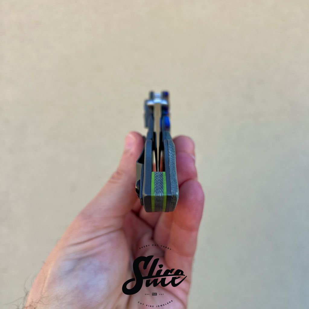 Yuna Knives Hard-1 flipper with a satin finished san mai damascus blade with dual thumb studs, twill carbon fiber show scale, timascus bolster, blasted titanium lock side and pocket clip, three piece twill carbon fiber and green G10 backspacer, twill carbon fiber lock side pivot surround, and custom made pivots.